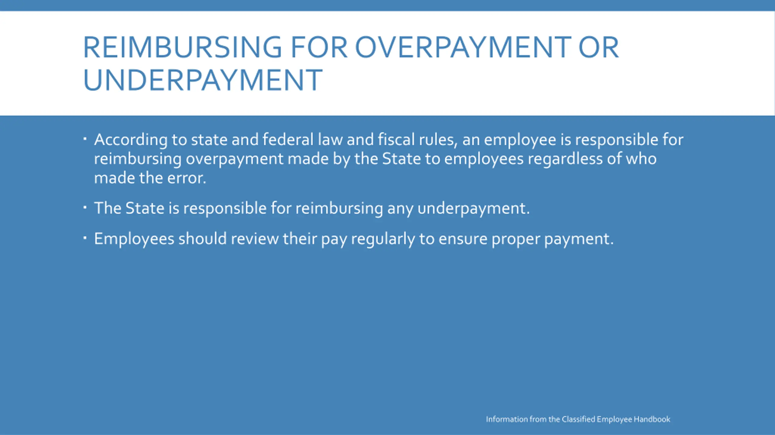 REIMBURSING FOR OVERPAYMENT OR UNDERPAYMENT According to state and federal law and fiscal rules, an employee is responsible for reimbursing overpayment made by the State to employees regardless of who made the error. The State is responsible for reimbursing any underpayment. Employees should review their pay regularly to ensure proper payment. Information from the Classified Employee Handbook