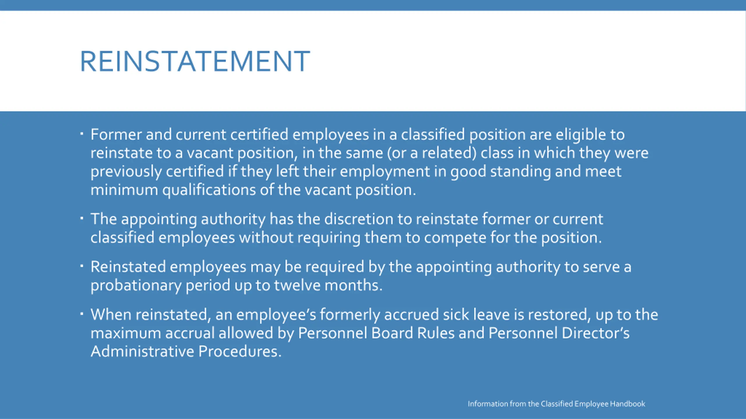 REINSTATEMENT Former and current certified employees in a classified position are eligible to reinstate to a vacant position, in the same (or a related) class in which they were previously certified if they left their employment in good standing and meet minimum qualifications of the vacant position. The appointing authority has the discretion to reinstate former or current classified employees without requiring them to compete for the position. Reinstated employees may be required by the appointing authority to serve a probationary period up to twelve months. When reinstated, an employee s formerly accrued sick leave is restored, up to the maximum accrual allowed by Personnel Board Rules and Personnel Director s Administrative Procedures. Information from the Classified Employee Handbook