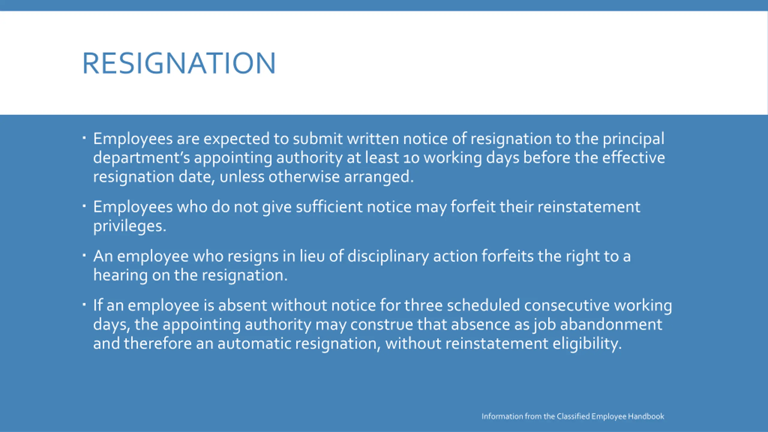 RESIGNATION Employees are expected to submit written notice of resignation to the principal department s appointing authority at least 10 working days before the effective resignation date, unless otherwise arranged. Employees who do not give sufficient notice may forfeit their reinstatement privileges. An employee who resigns in lieu of disciplinary action forfeits the right to a hearing on the resignation. If an employee is absent without notice for three scheduled consecutive working days, the appointing authority may construe that absence as job abandonment and therefore an automatic resignation, without reinstatement eligibility. Information from the Classified Employee Handbook