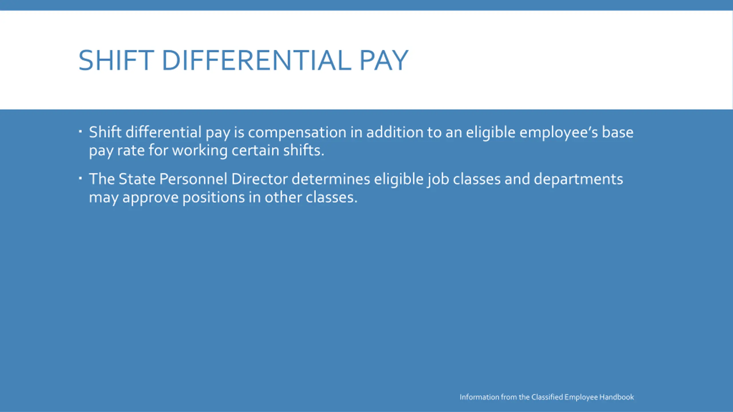 SHIFT DIFFERENTIAL PAY Shift differential pay is compensation in addition to an eligible employee s base pay rate for working certain shifts. The State Personnel Director determines eligible job classes and departments may approve positions in other classes. Information from the Classified Employee Handbook