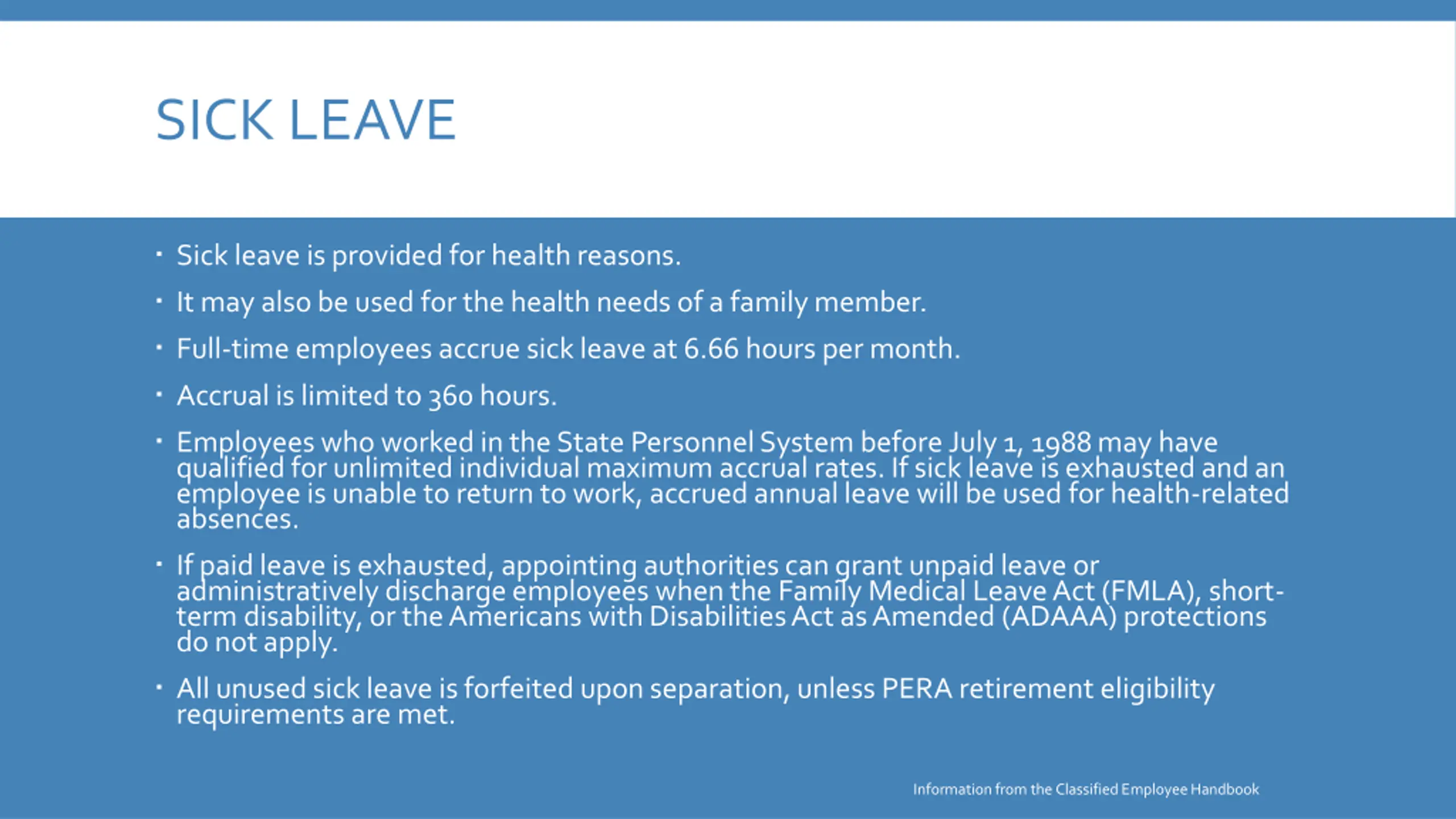 SICK LEAVE Sick leave is provided for health reasons. It may also be used for the health needs of a family member. Full-time employees accrue sick leave at 6.66 hours per month. Accrual is limited to 360 hours. Employees who worked in the State Personnel System before July 1, 1988 may have qualified for unlimited individual maximum accrual rates. If sick leave is exhausted and an employee is unable to return to work, accrued annual leave will be used for health-related absences. If paid leave is exhausted, appointing authorities can grant unpaid leave or administratively discharge employees when the Family Medical Leave Act (FMLA), short- term disability, or the Americans with Disabilities Act as Amended (ADAAA) protections do not apply. All unused sick leave is forfeited upon separation, unless PERA retirement eligibility requirements are met. Information from the Classified Employee Handbook