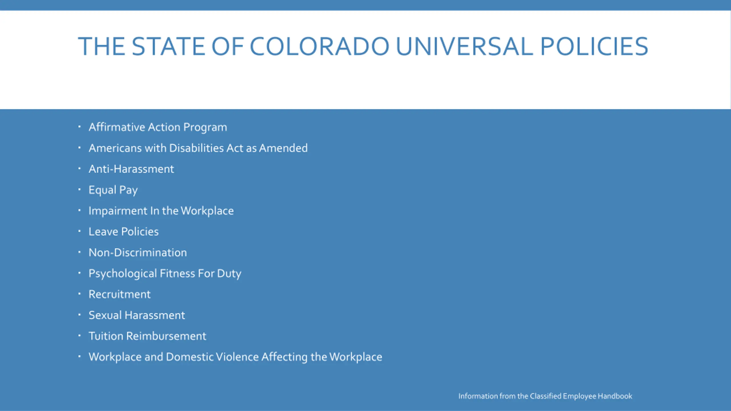 THE STATE OF COLORADO UNIVERSAL POLICIES Affirmative Action Program Americans with Disabilities Act as Amended Anti-Harassment Equal Pay Impairment In the Workplace Leave Policies Non-Discrimination Psychological Fitness For Duty Recruitment Sexual Harassment Tuition Reimbursement Workplace and Domestic Violence Affecting the Workplace Information from the Classified Employee Handbook