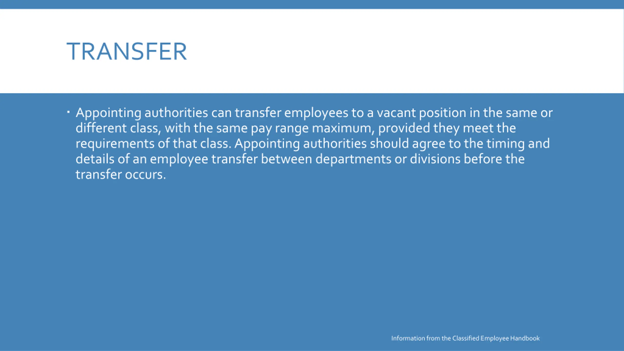 TRANSFER Appointing authorities can transfer employees to a vacant position in the same or different class, with the same pay range maximum, provided they meet the requirements of that class. Appointing authorities should agree to the timing and details of an employee transfer between departments or divisions before the transfer occurs. Information from the Classified Employee Handbook