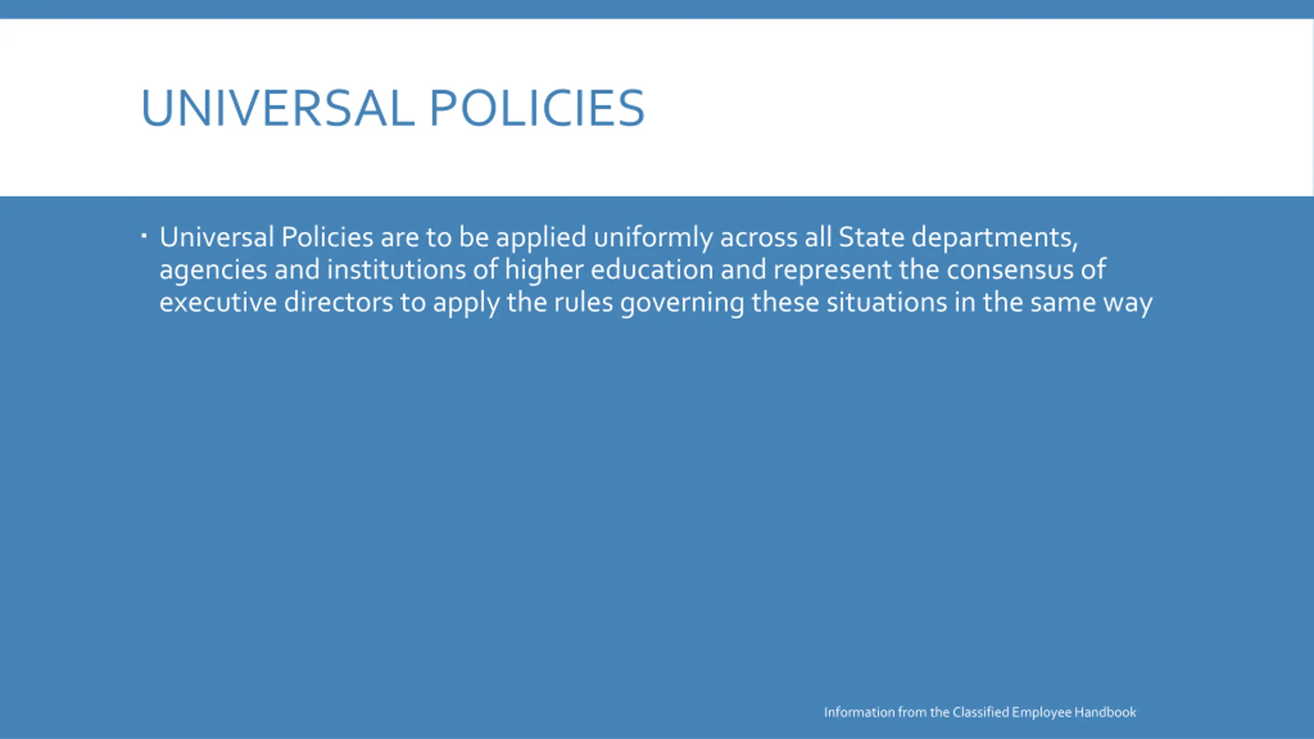 UNIVERSAL POLICIES Universal Policies are to be applied uniformly across all State departments, agencies and institutions of higher education and represent the consensus of executive directors to apply the rules governing these situations in the same way Information from the Classified Employee Handbook