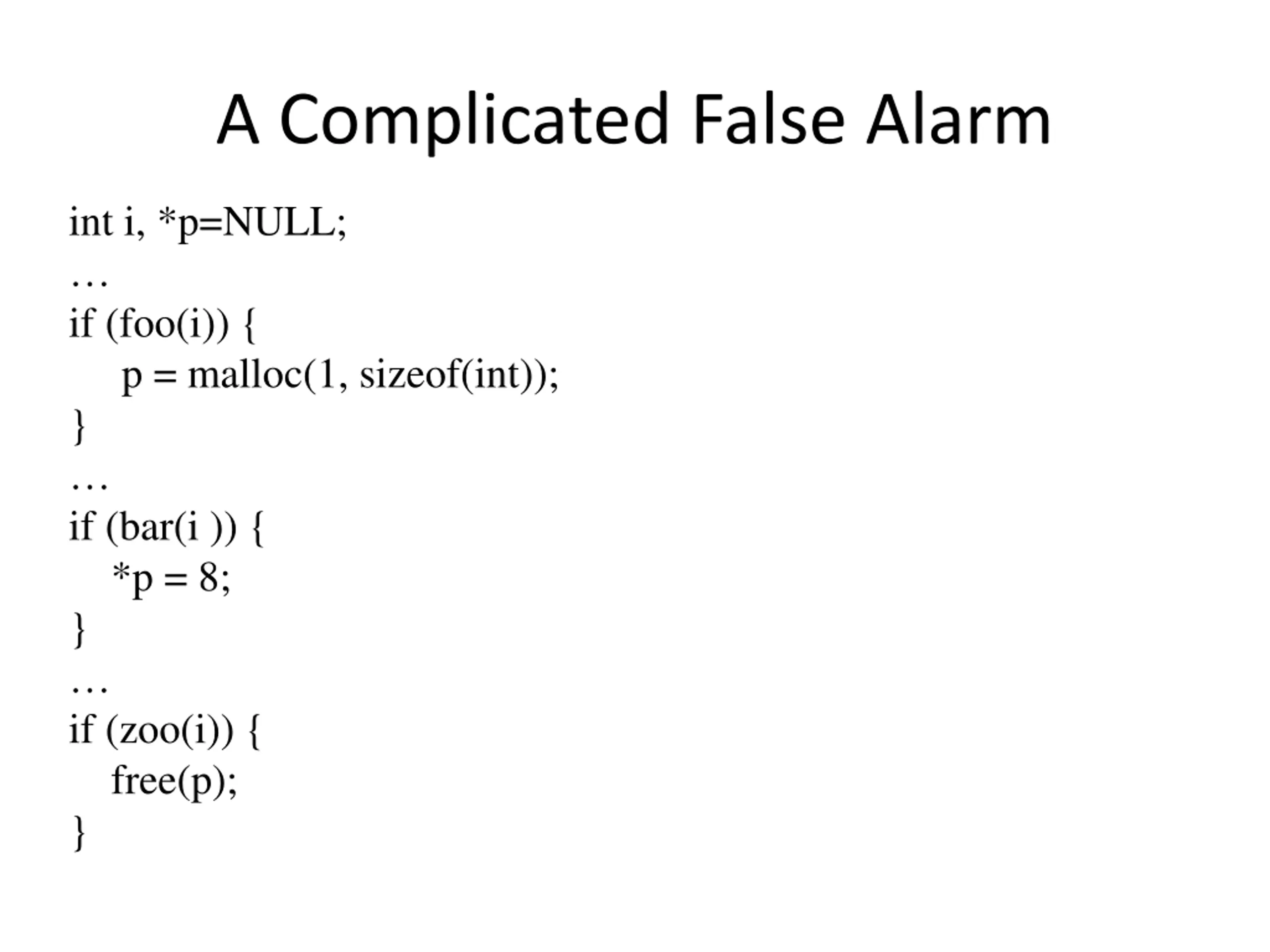 A Complicated False Alarm int i, *p=NULL; if (foo(i)) { p = malloc(1, sizeof(int)); } if (bar(i )) { *p = 8; } if (zoo(i)) { free(p); }