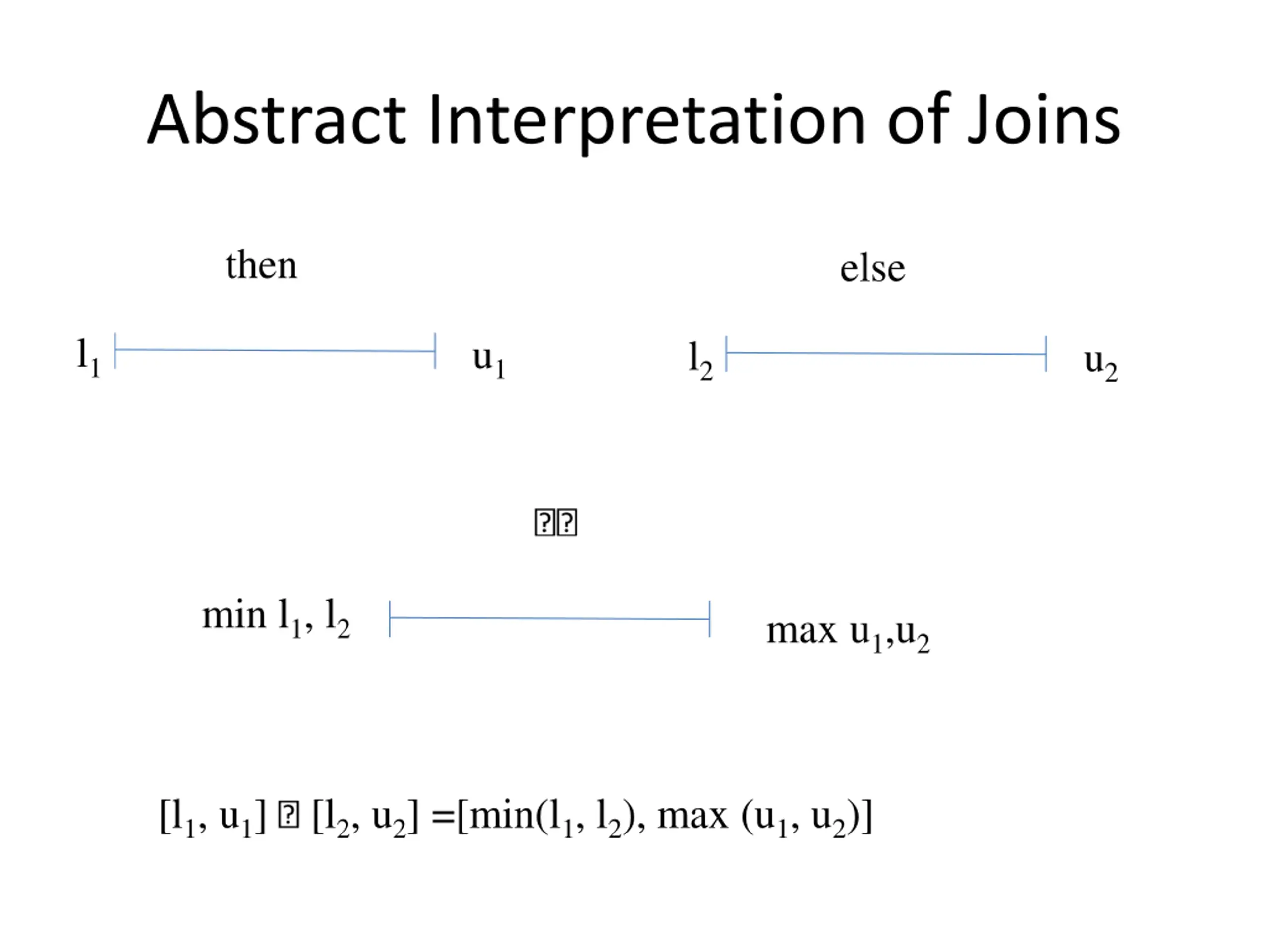 Abstract Interpretation of Joins then else l1 u1 l2 u2 min l1, l2 max u1,u2 [l1, u1] [l2, u2] =[min(l1, l2), max (u1, u2)]