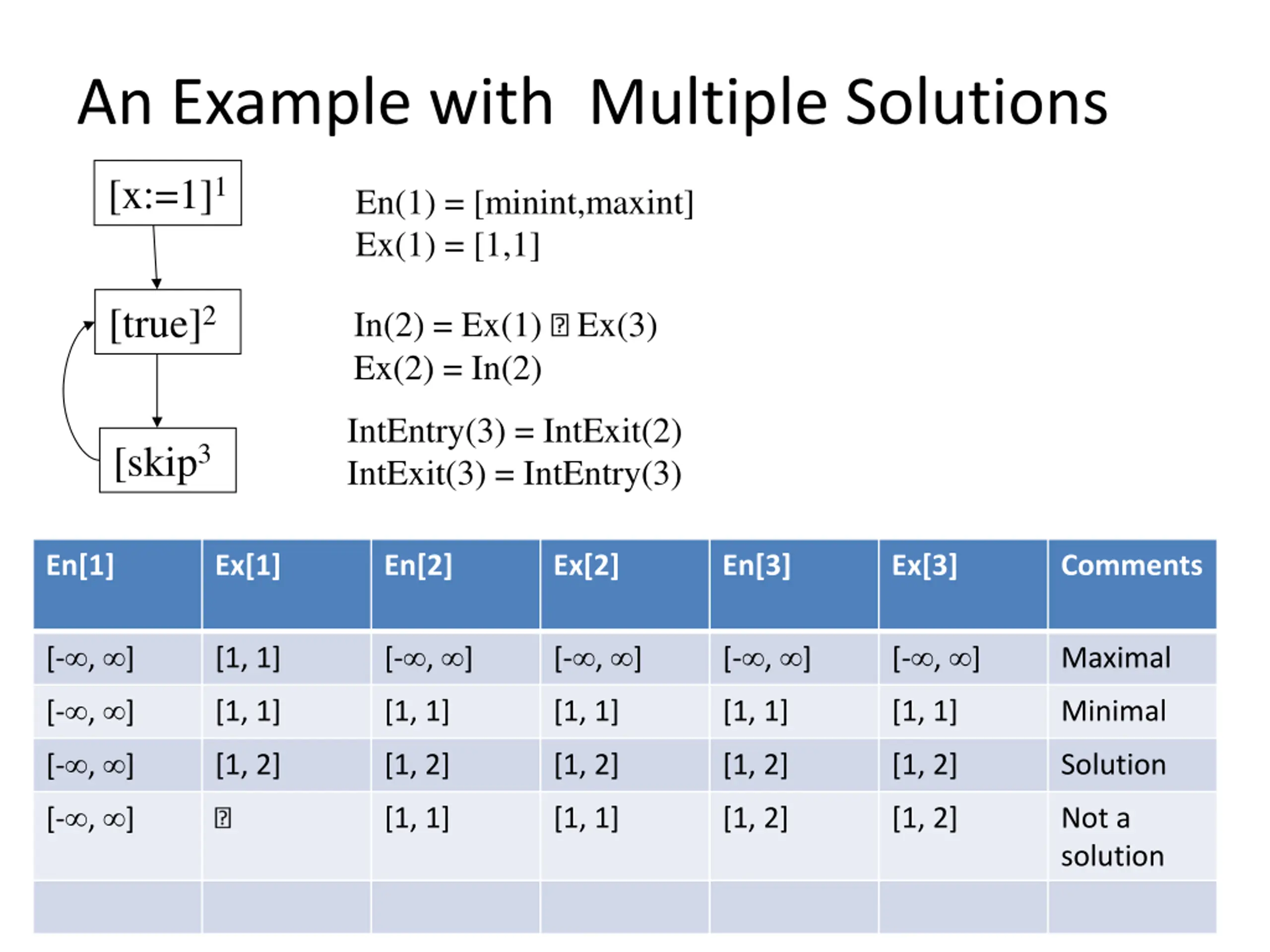 An Example with Multiple Solutions [x:=1]1 En(1) = [minint,maxint] Ex(1) = [1,1] [true]2 In(2) = Ex(1) Ex(3) Ex(2) = In(2) IntEntry(3) = IntExit(2) IntExit(3) = IntEntry(3) [skip3 En[1] Ex[1] En[2] Ex[2] En[3] Ex[3] Comments [- , ] [- , ] [- , ] [- , ] [- , ] [- , ] [- , ] [- , ] [1, 1] Maximal [1, 1] [1, 1] [1, 1] [1, 1] [1, 1] Minimal [1, 2] [1, 2] [1, 2] [1, 2] [1, 2] Solution [1, 1] [1, 1] [1, 2] [1, 2] Not a solution