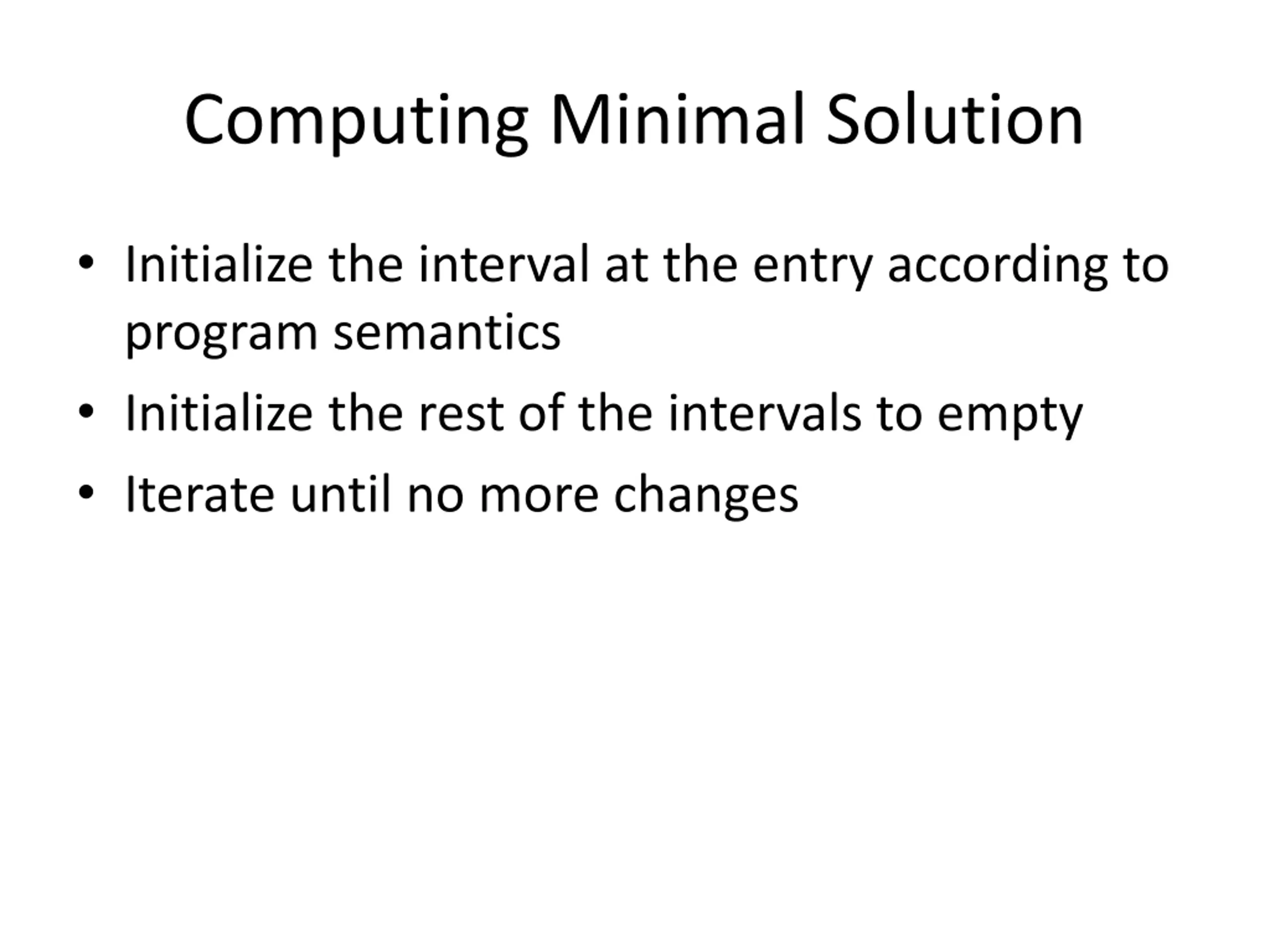 Computing Minimal Solution Initialize the interval at the entry according to program semantics Initialize the rest of the intervals to empty Iterate until no more changes