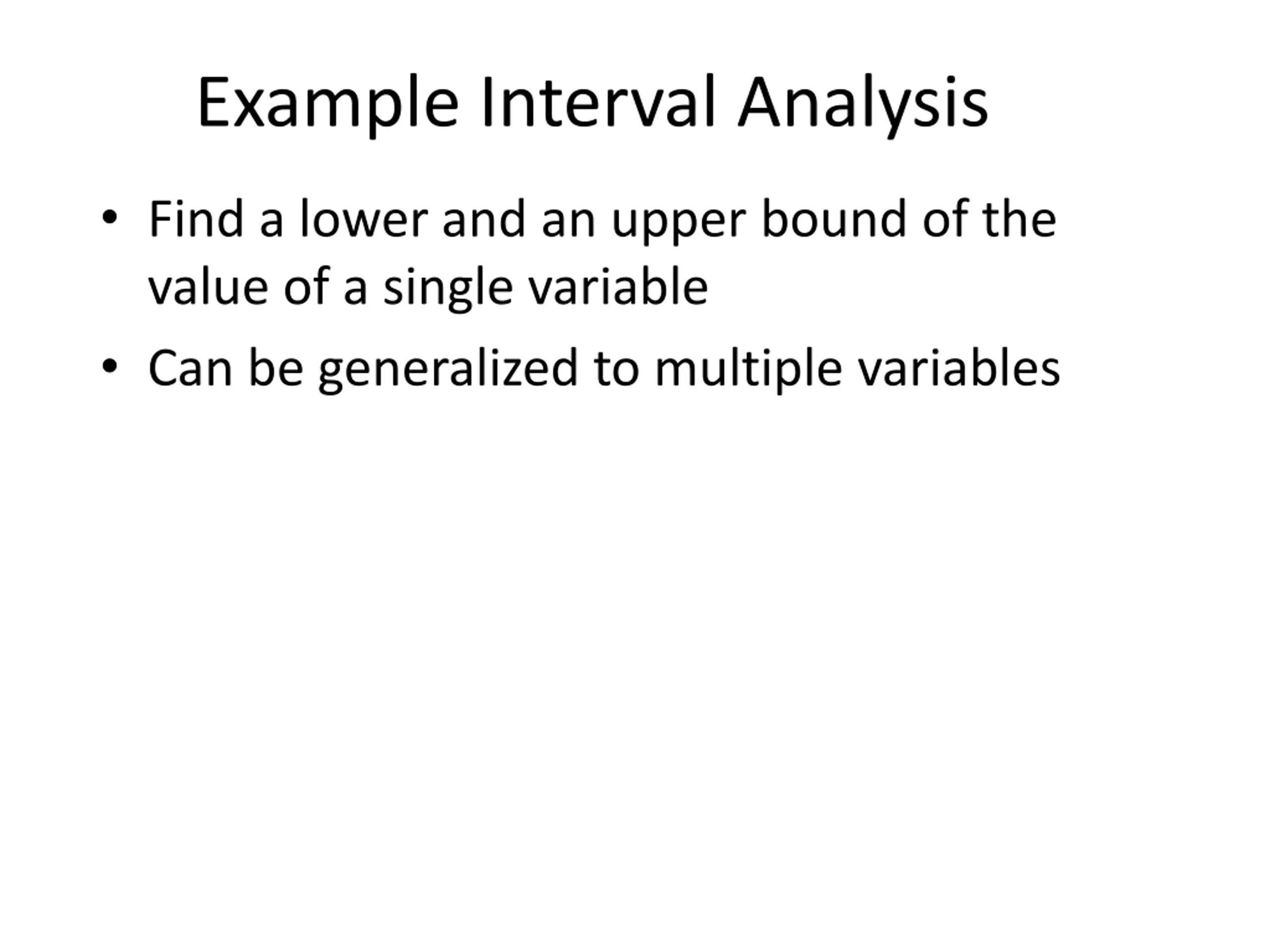 Example Interval Analysis Find a lower and an upper bound of the value of a single variable Can be generalized to multiple variables
