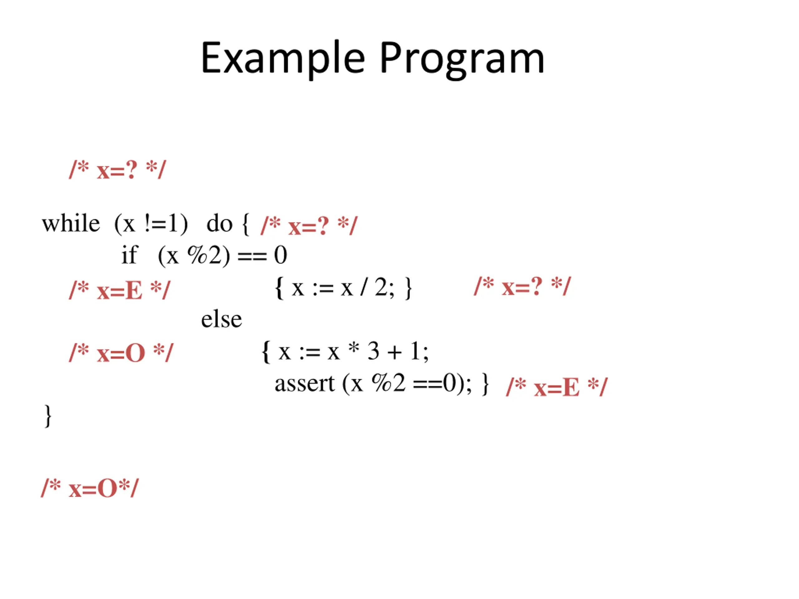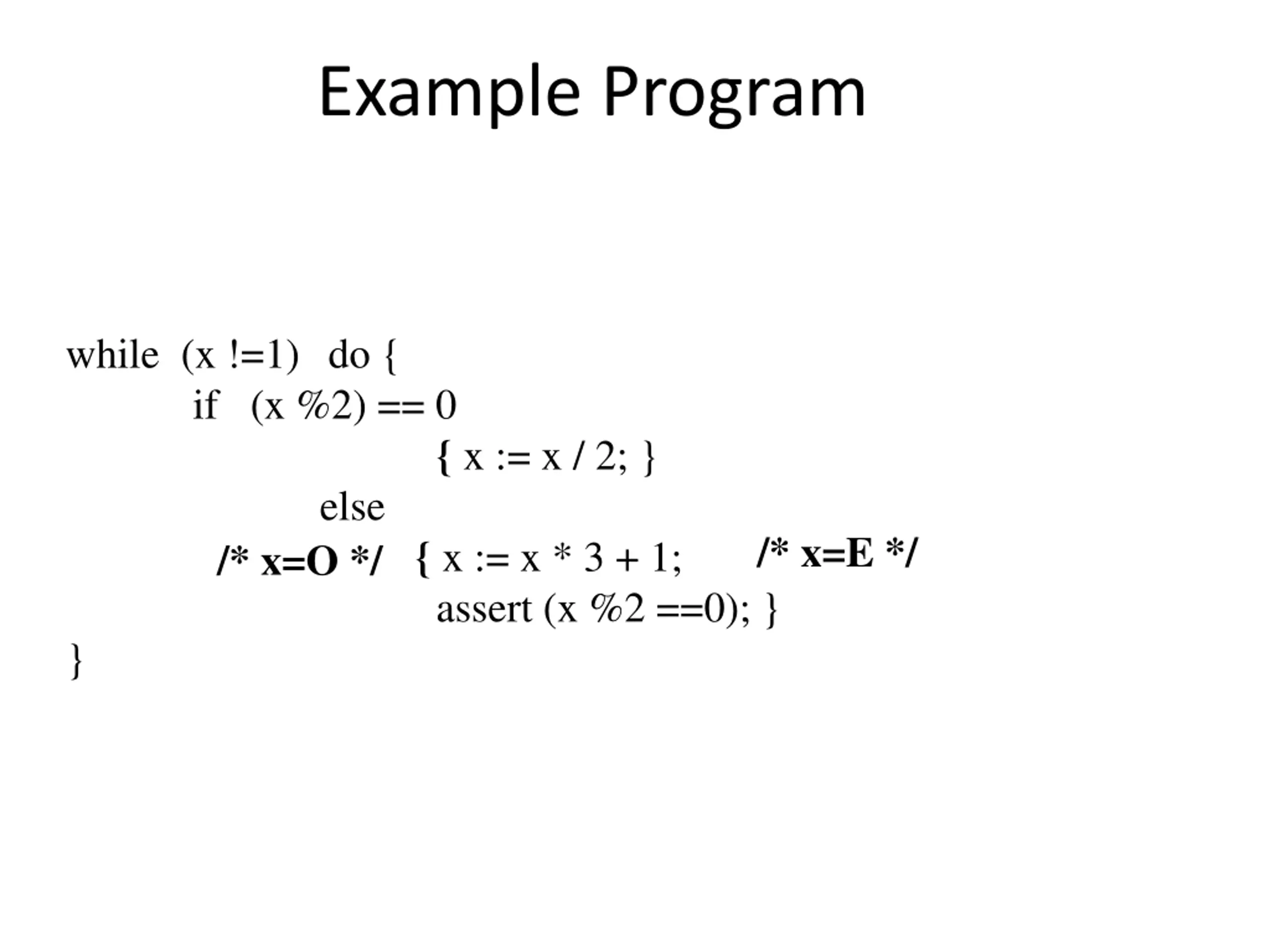 Example Program /* x=? */ while (x !=1)do { if(x %2) == 0 assert (x %2 ==0); } } /* x=? */ /* x=? */ { x := x / 2; } else { x := x * 3 + 1; /* x=E */ /* x=O */ /* x=E */ /* x=O*/