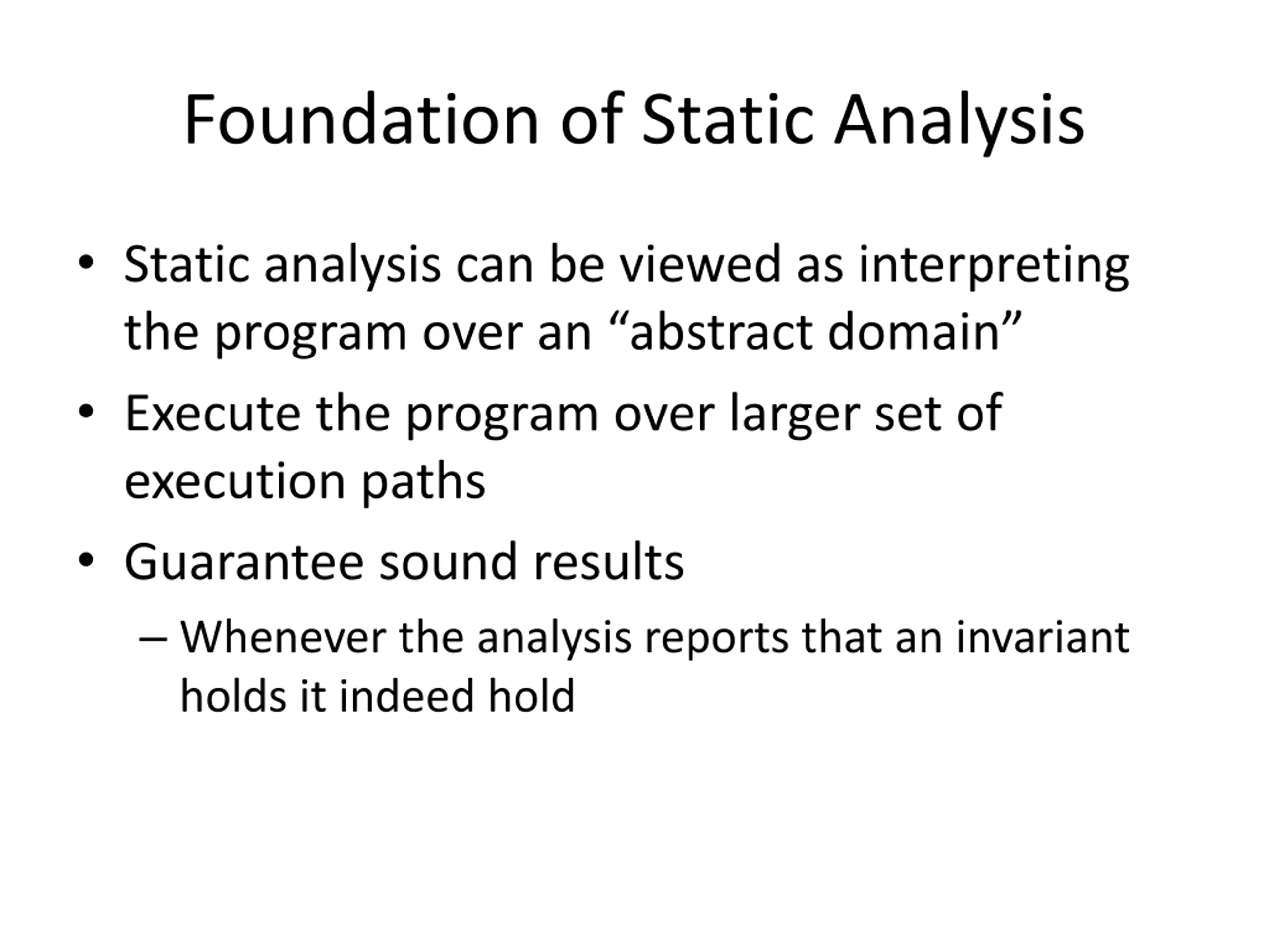 Foundation of Static Analysis Static analysis can be viewed as interpreting the program over an abstract domain Execute the program over larger set of execution paths Guarantee sound results Whenever the analysis reports that an invariant holds it indeed hold