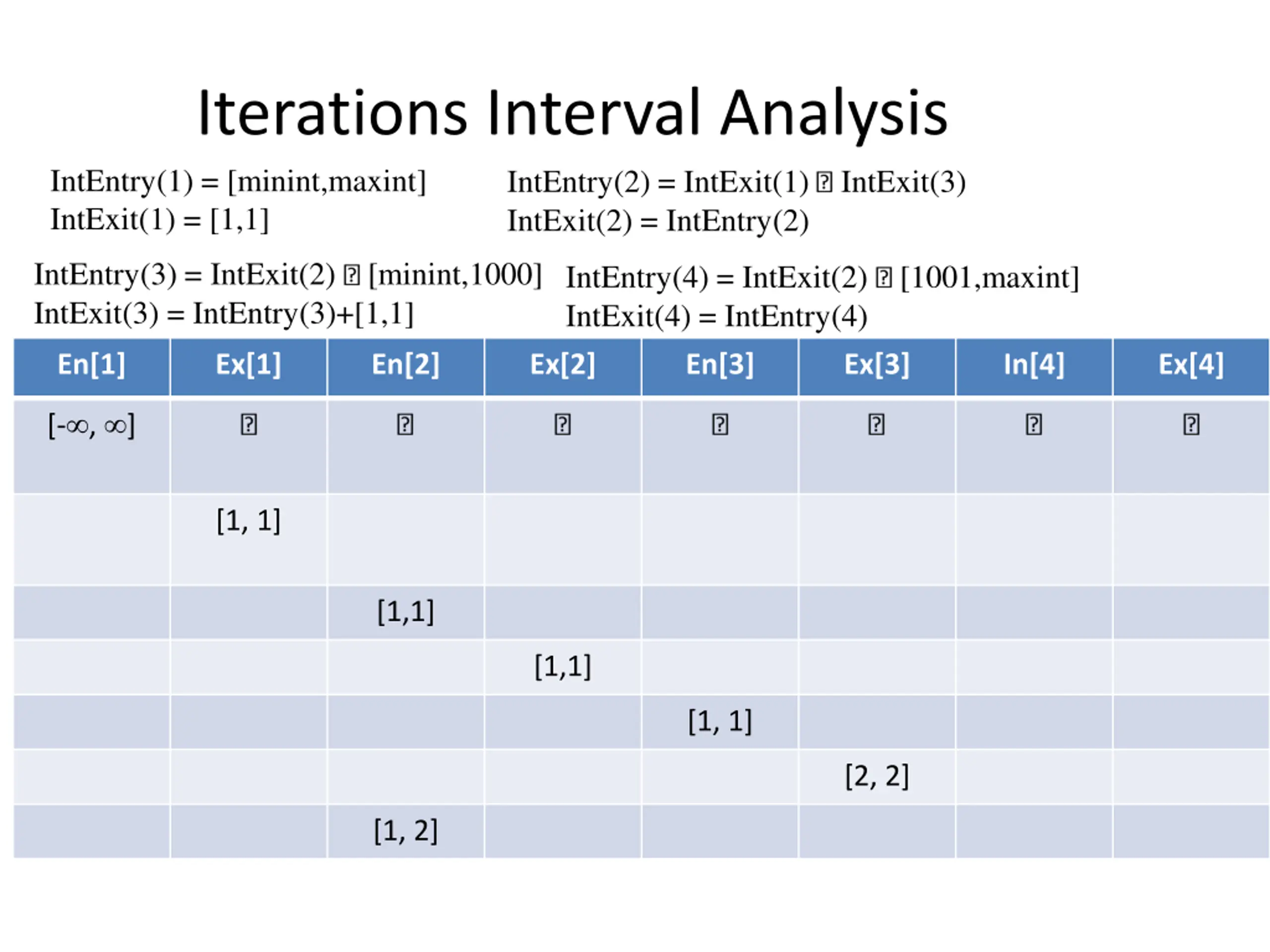 Iterations Interval Analysis IntEntry(1) = [minint,maxint] IntExit(1) = [1,1] IntEntry(2) = IntExit(1) IntExit(3) IntExit(2) = IntEntry(2) IntEntry(3) = IntExit(2) [minint,1000] IntExit(3) = IntEntry(3)+[1,1] IntEntry(4) = IntExit(2) [1001,maxint] IntExit(4) = IntEntry(4) En[1] Ex[1] En[2] Ex[2] En[3] Ex[3] In[4] Ex[4] [- , ] [1, 1] [1,1] [1,1] [1, 1] [2, 2] [1, 2]