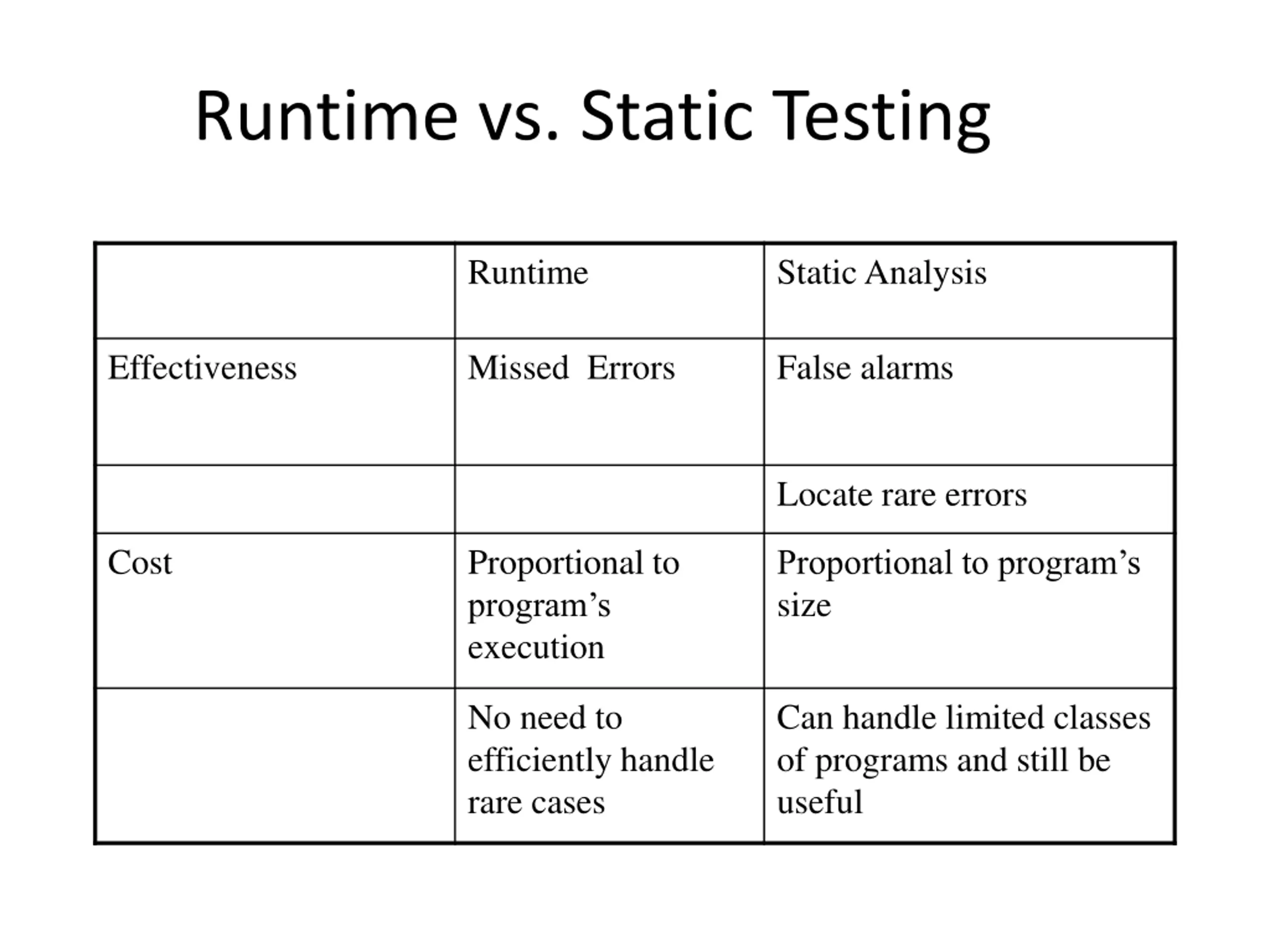Runtime vs. Static Testing Runtime Static Analysis Effectiveness Missed Errors False alarms Locate rare errors Cost Proportional to program s execution Proportional to program s size No need to efficiently handle rare cases Can handle limited classes of programs and still be useful