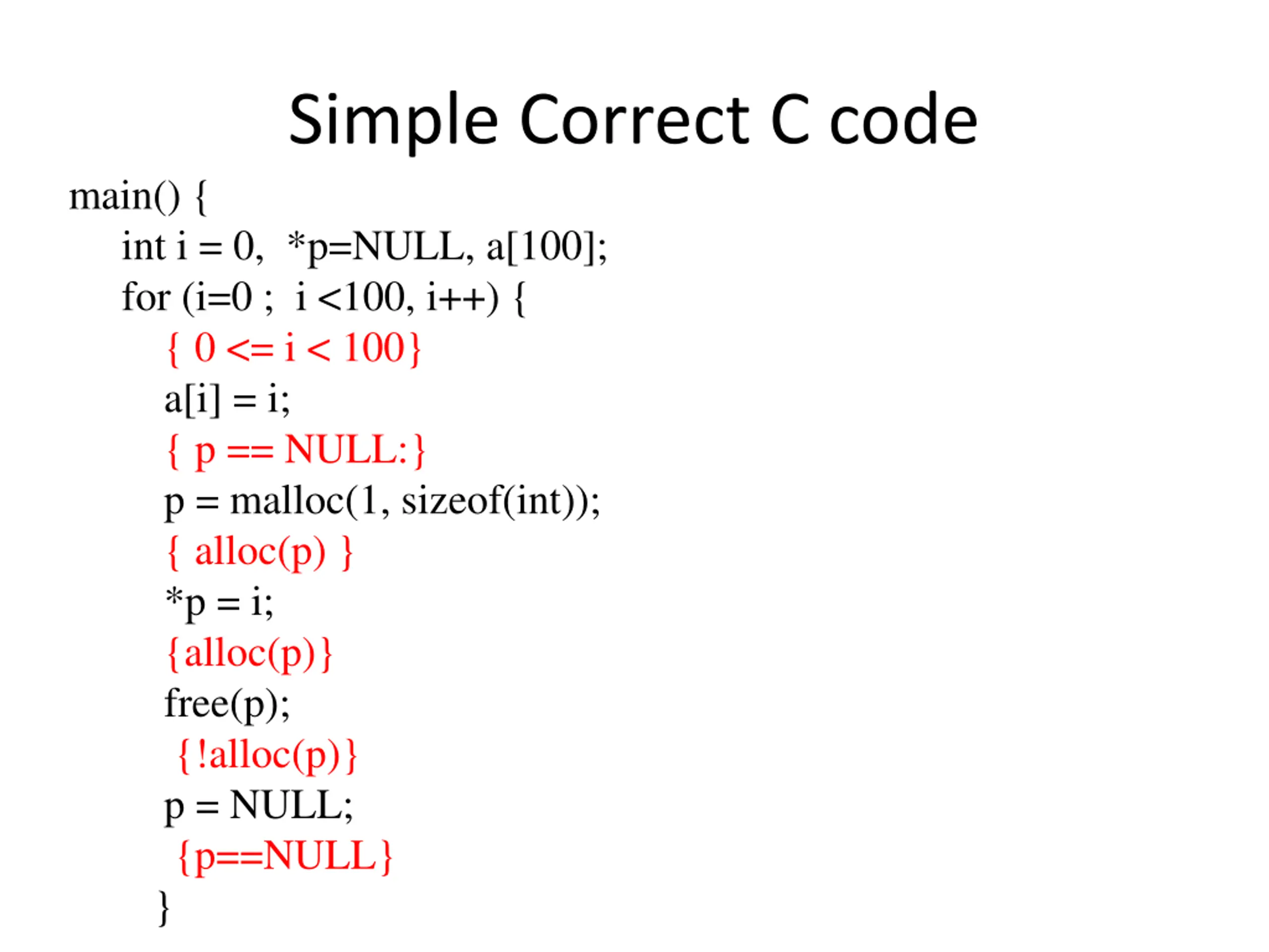 Simple Correct C code main() { int i = 0, *p=NULL, a[100]; for (i=0 ; i <100, i++) { { 0 <= i < 100} a[i] = i; { p == NULL:} p = malloc(1, sizeof(int)); { alloc(p) } *p = i; {alloc(p)} free(p); {!alloc(p)} p = NULL; {p==NULL} }