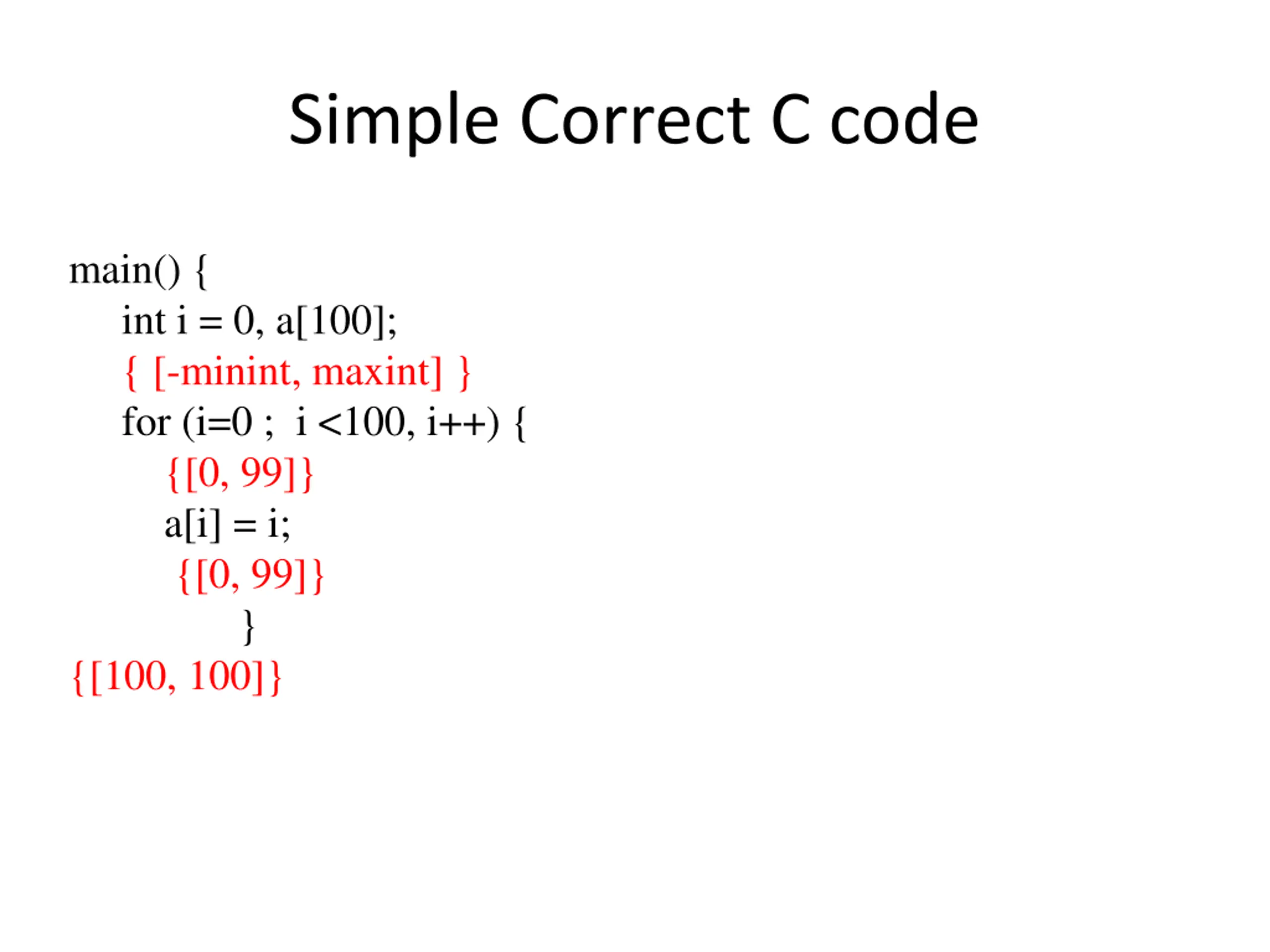 Simple Correct C code main() { int i = 0, a[100]; { [-minint, maxint] } for (i=0 ; i <100, i++) { {[0, 99]} a[i] = i; {[0, 99]} } {[100, 100]}