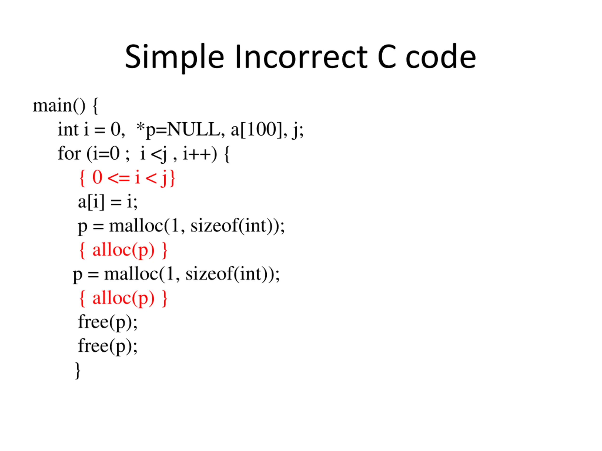Simple Incorrect C code main() { int i = 0, *p=NULL, a[100], j; for (i=0 ; i <j , i++) { { 0 <= i < j} a[i] = i; p = malloc(1, sizeof(int)); { alloc(p) } p = malloc(1, sizeof(int)); { alloc(p) } free(p); free(p); }