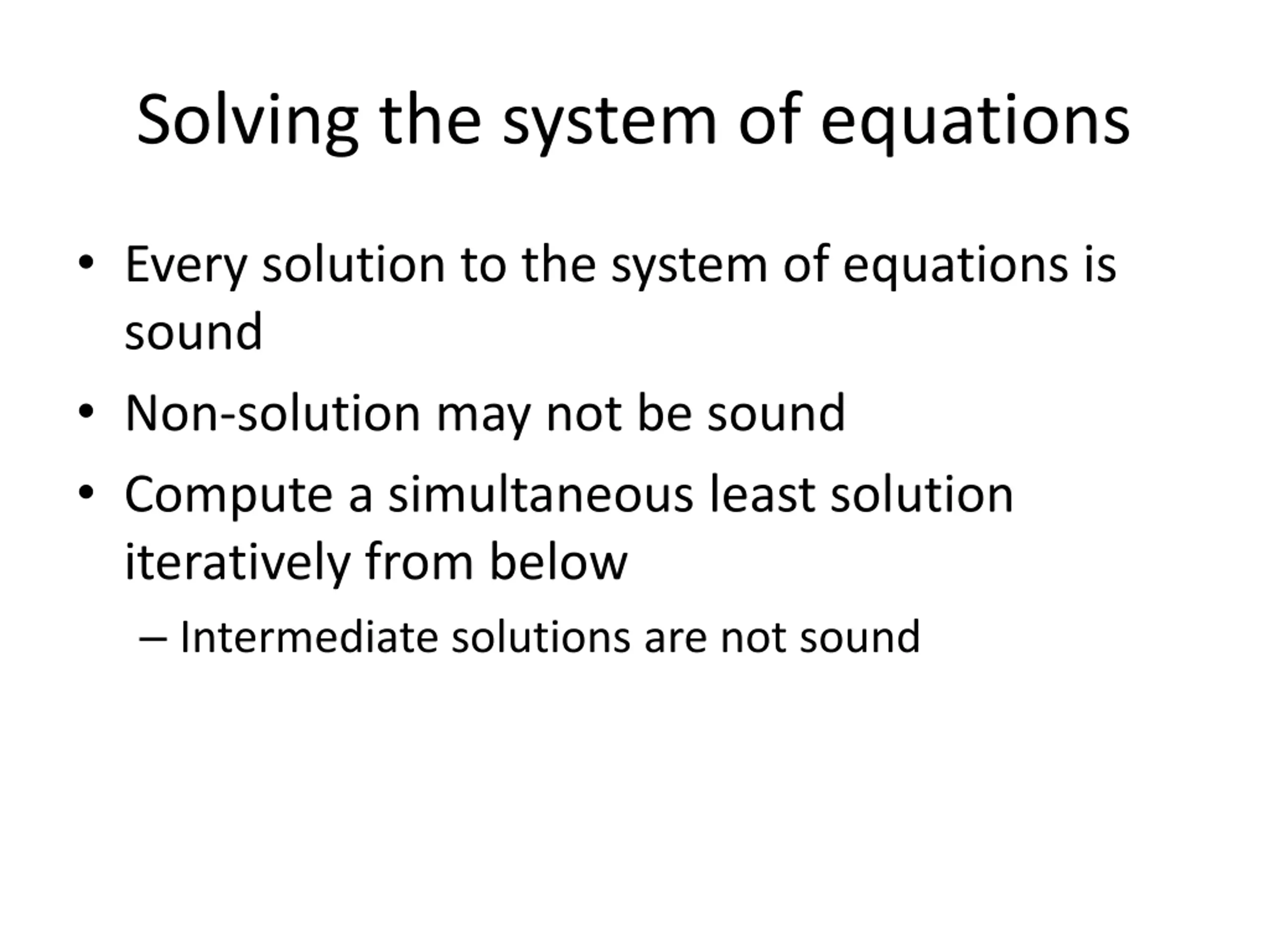 Solving the system of equations Every solution to the system of equations is sound Non-solution may not be sound Compute a simultaneous least solution iteratively from below Intermediate solutions are not sound
