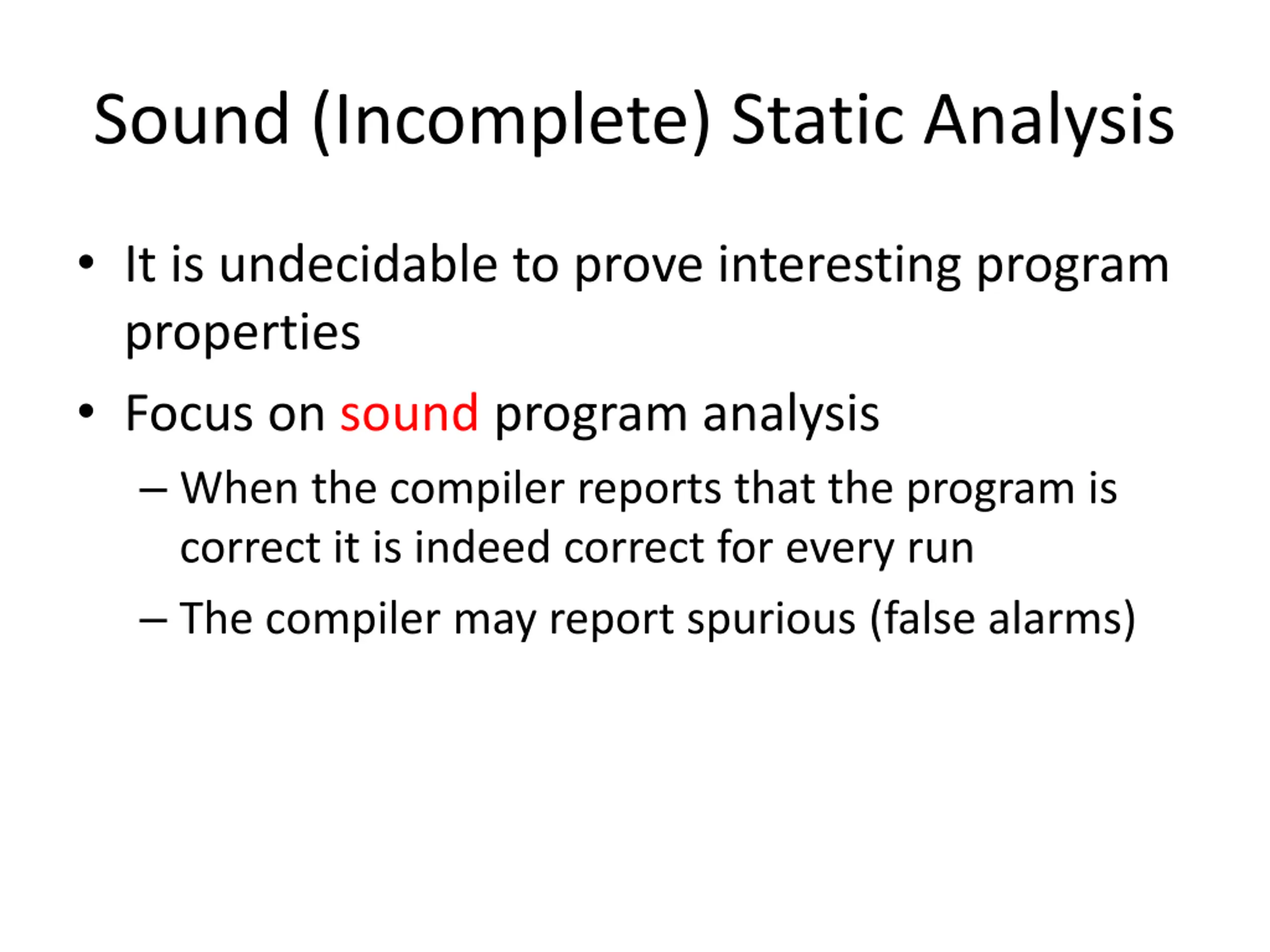 Sound (Incomplete) Static Analysis It is undecidable to prove interesting program properties Focus on sound program analysis When the compiler reports that the program is correct it is indeed correct for every run The compiler may report spurious (false alarms)