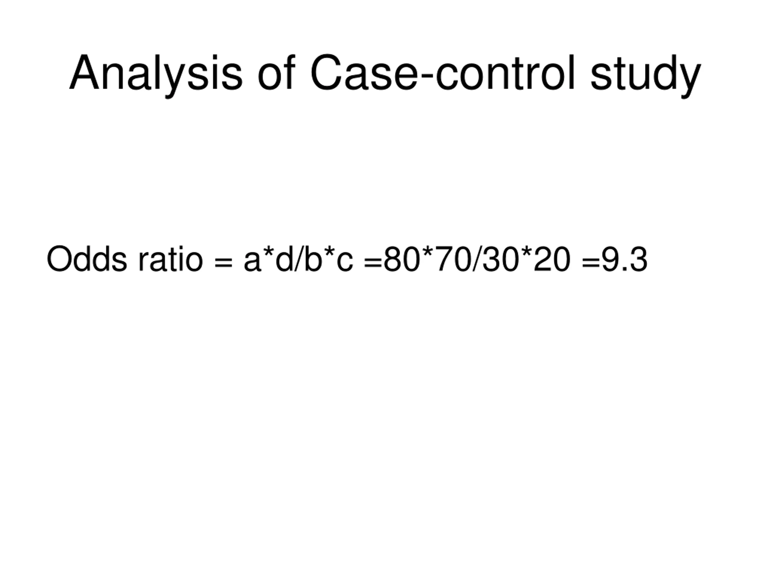 Analysis of Case-control study Odds ratio = a*d/b*c =80*70/30*20 =9.3