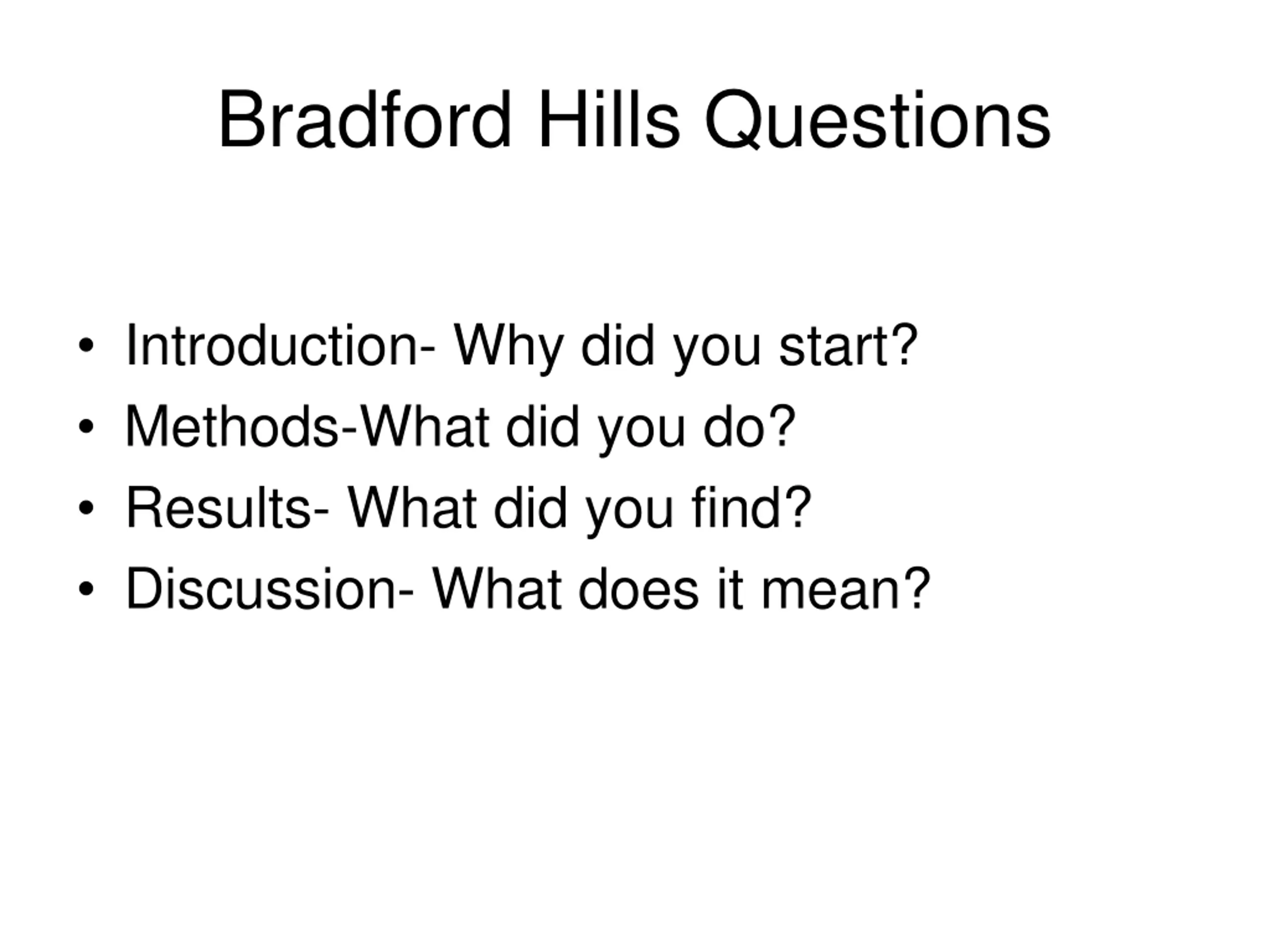 Bradford Hills Questions Introduction- Why did you start? Methods-What did you do? Results- What did you find? Discussion- What does it mean?