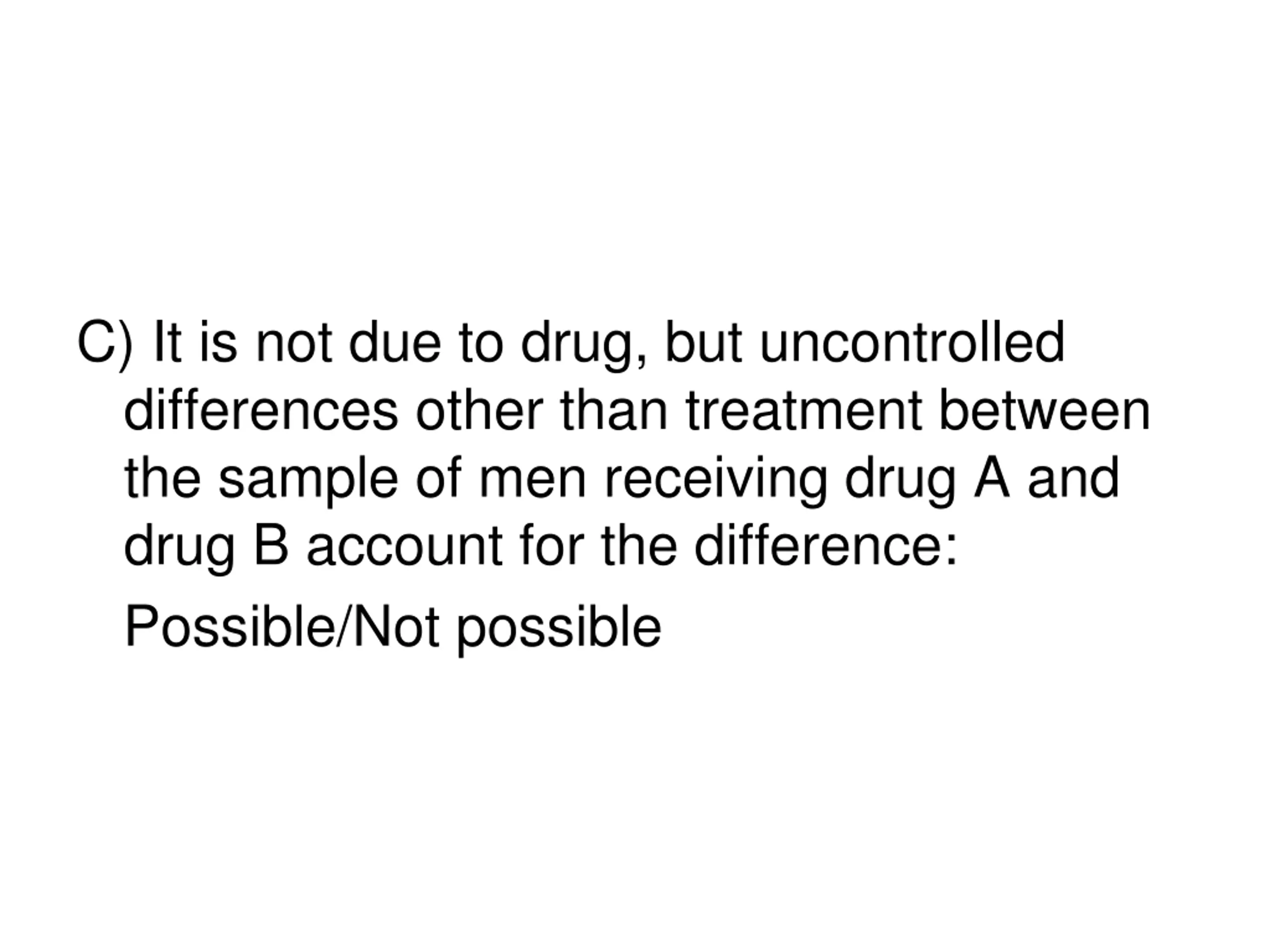 C) It is not due to drug, but uncontrolled differences other than treatment between the sample of men receiving drug A and drug B account for the difference: Possible/Not possible