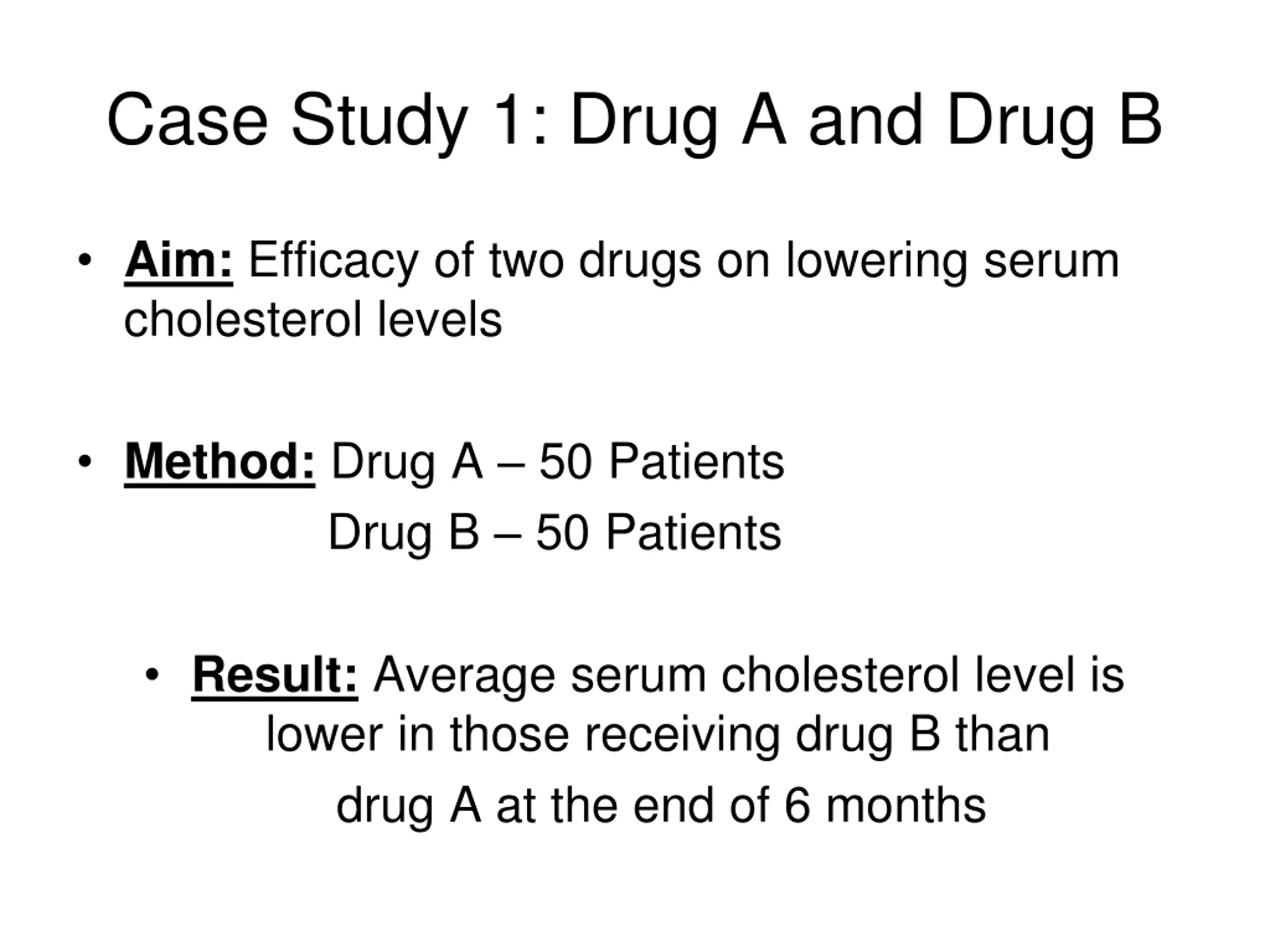 Case Study 1: Drug A and Drug B Aim: Efficacy of two drugs on lowering serum cholesterol levels Method: Drug A 50 Patients Drug B 50 Patients Result: Average serum cholesterol level is lower in those receiving drug B than drug A at the end of 6 months