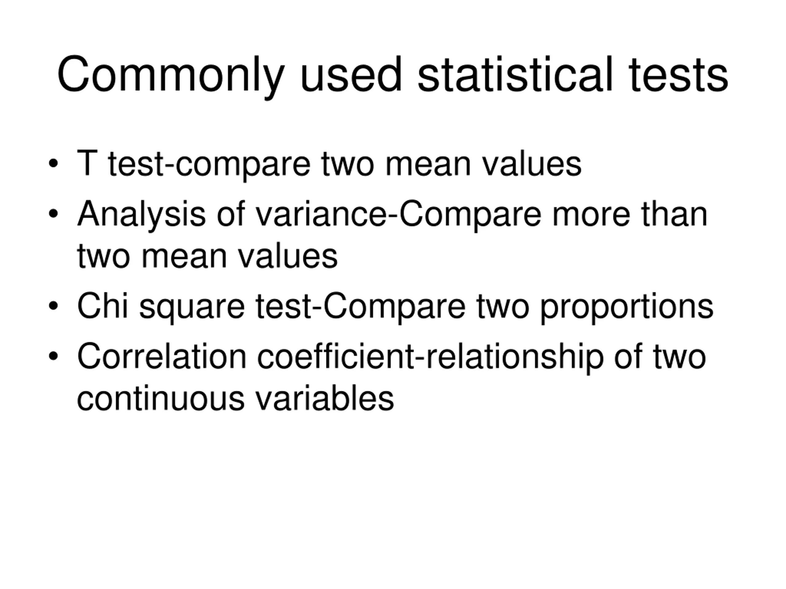 Commonly used statistical tests T test-compare two mean values Analysis of variance-Compare more than two mean values Chi square test-Compare two proportions Correlation coefficient-relationship of two continuous variables