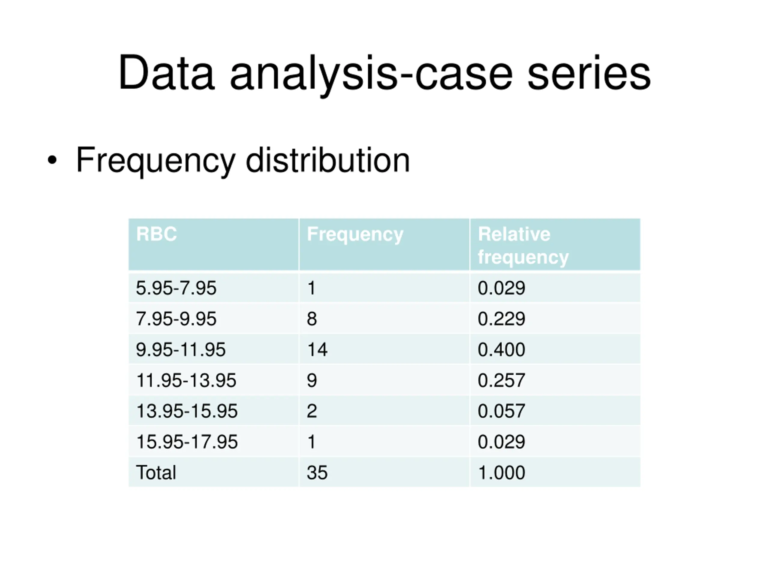 Data analysis-case series Frequency distribution RBC Frequency Relative frequency 0.029 0.229 0.400 0.257 0.057 0.029 1.000 5.95-7.95 7.95-9.95 9.95-11.95 11.95-13.95 13.95-15.95 15.95-17.95 Total 1 8 14 9 2 1 35