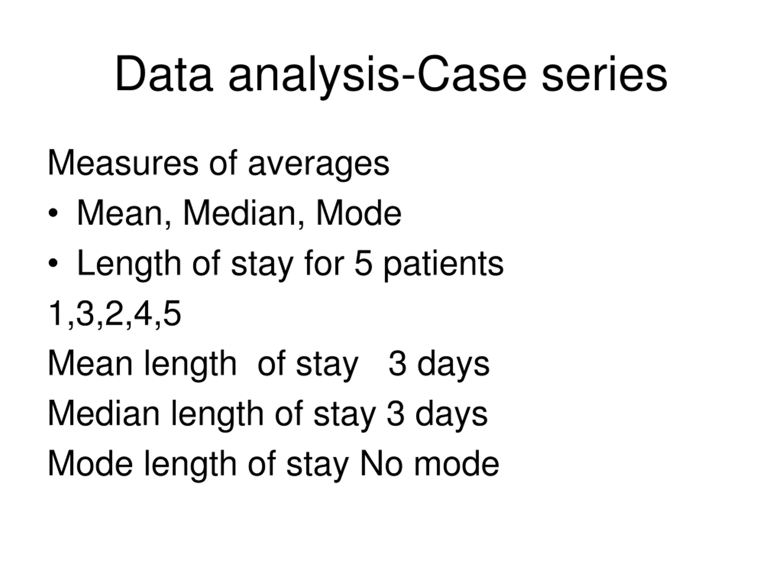 Data analysis-Case series Measures of averages Mean, Median, Mode Length of stay for 5 patients 1,3,2,4,5 Mean length of stay 3 days Median length of stay 3 days Mode length of stay No mode