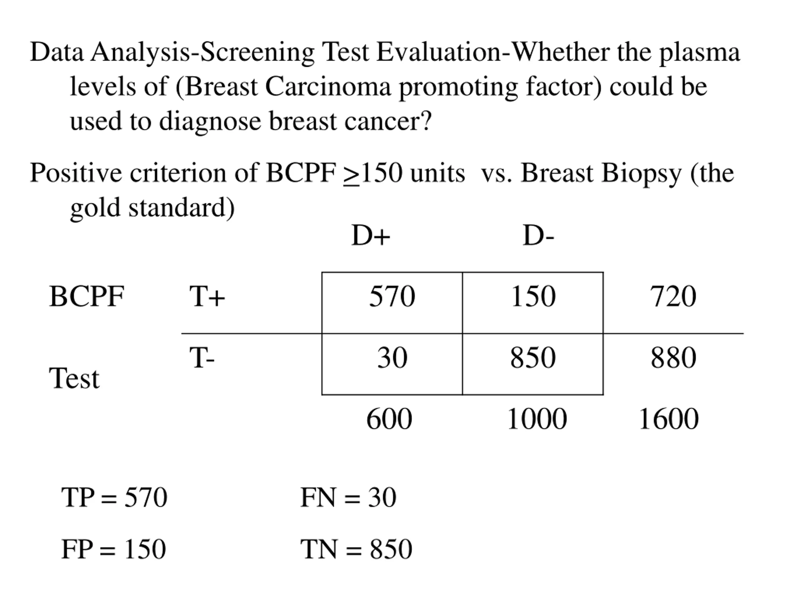 Data Analysis-Screening Test Evaluation-Whether the plasma levels of (Breast Carcinoma promoting factor) could be used to diagnose breast cancer? Positive criterion of BCPF >150 units vs. Breast Biopsy (the gold standard) D+ D- BCPF Test T+ 570 150 720 T- 30 850 880 600 1000 1600 TP = 570 FN = 30 FP = 150 TN = 850