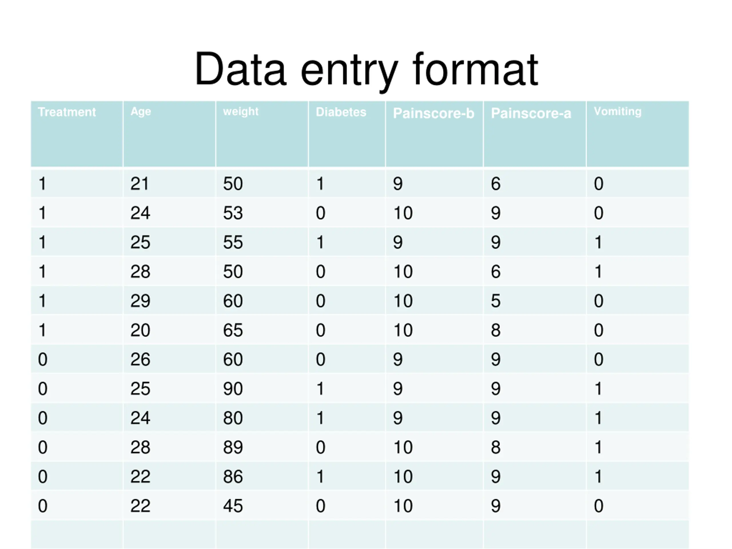 Data entry format Age weight Vomiting Painscore-b Painscore-a Treatment Diabetes 1 1 1 1 1 1 0 0 0 0 0 0 21 24 25 28 29 20 26 25 24 28 22 22 50 53 55 50 60 65 60 90 80 89 86 45 1 0 1 0 0 0 0 1 1 0 1 0 9 10 9 10 10 10 9 9 9 10 10 10 6 9 9 6 5 8 9 9 9 8 9 9 0 0 1 1 0 0 0 1 1 1 1 0