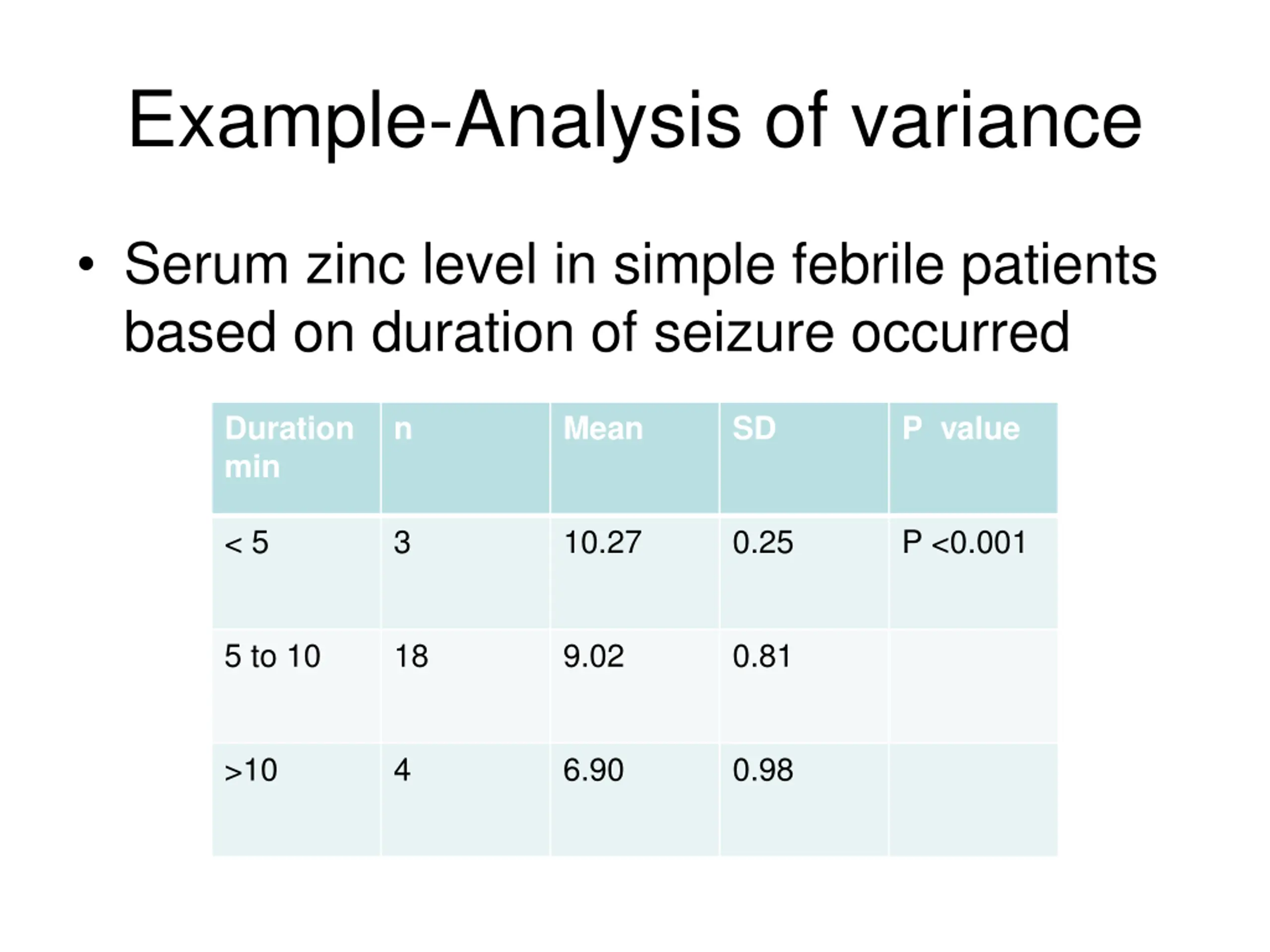 Example-Analysis of variance Serum zinc level in simple febrile patients based on duration of seizure occurred Duration min n Mean SD P value < 5 3 10.27 0.25 P <0.001 5 to 10 18 9.02 0.81 >10 4 6.90 0.98
