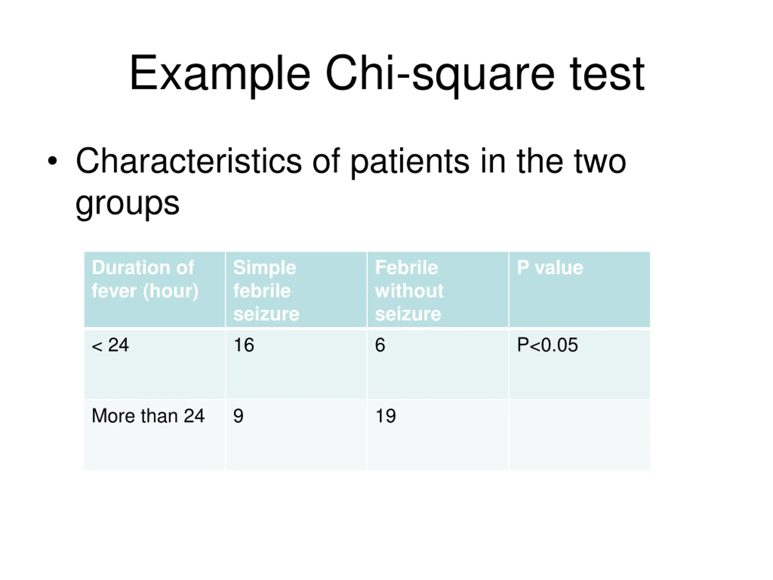 Example Chi-square test Characteristics of patients in the two groups Duration of fever (hour) Simple febrile seizure 16 Febrile without seizure 6 P value < 24 P<0.05 More than 24 9 19