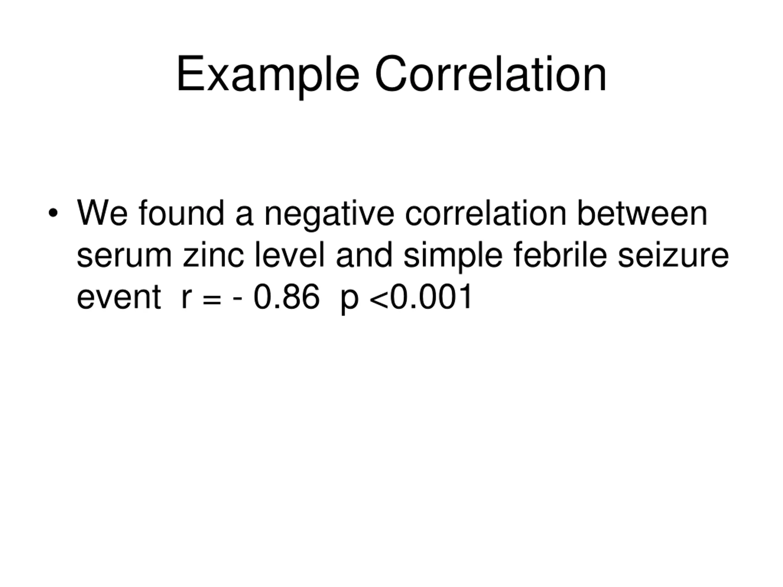 Example Correlation We found a negative correlation between serum zinc level and simple febrile seizure event r = - 0.86 p <0.001