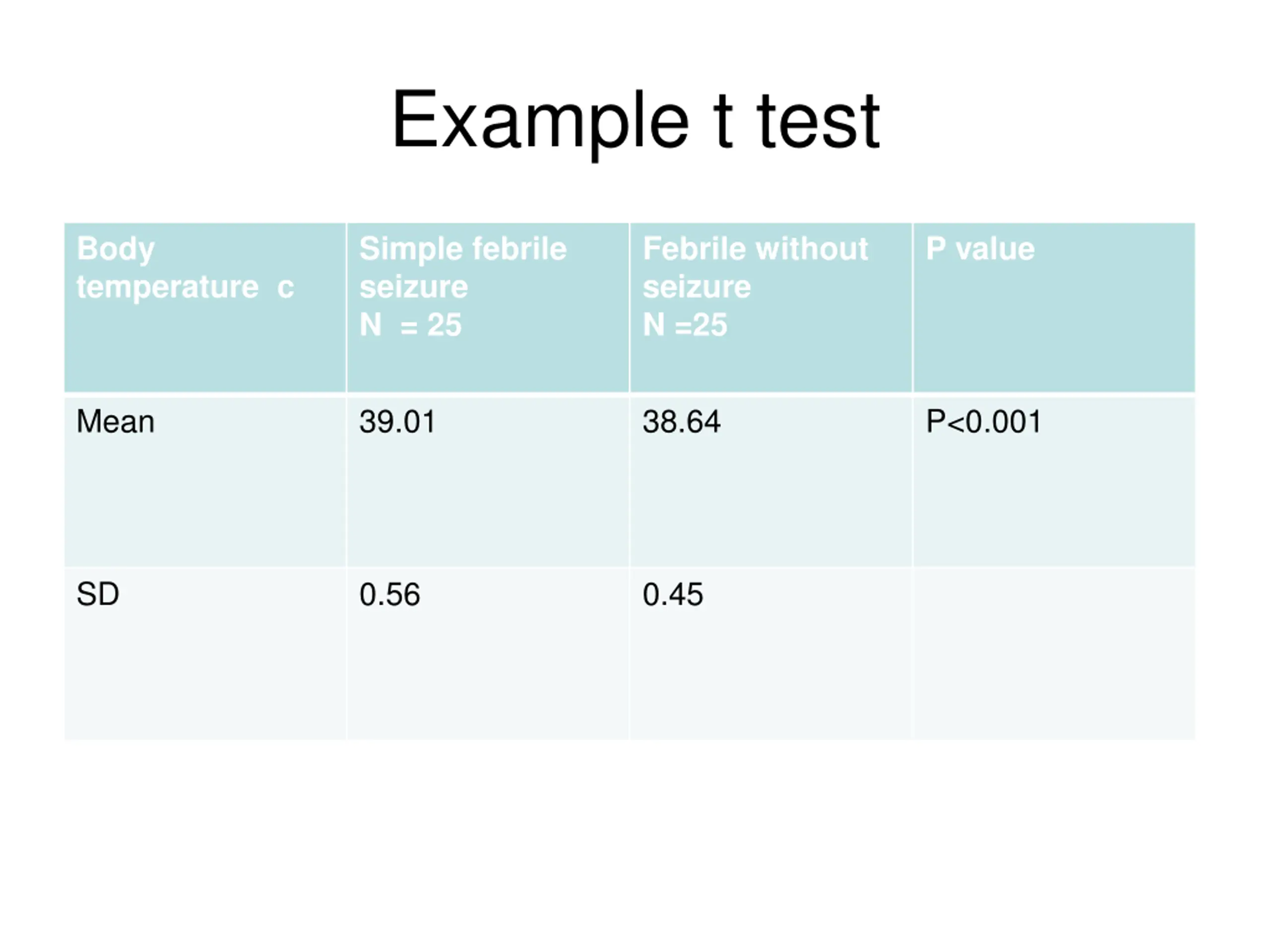 Example t test Body temperature c Simple febrile seizure N = 25 Febrile without seizure N =25 P value Mean 39.01 38.64 P<0.001 SD 0.56 0.45