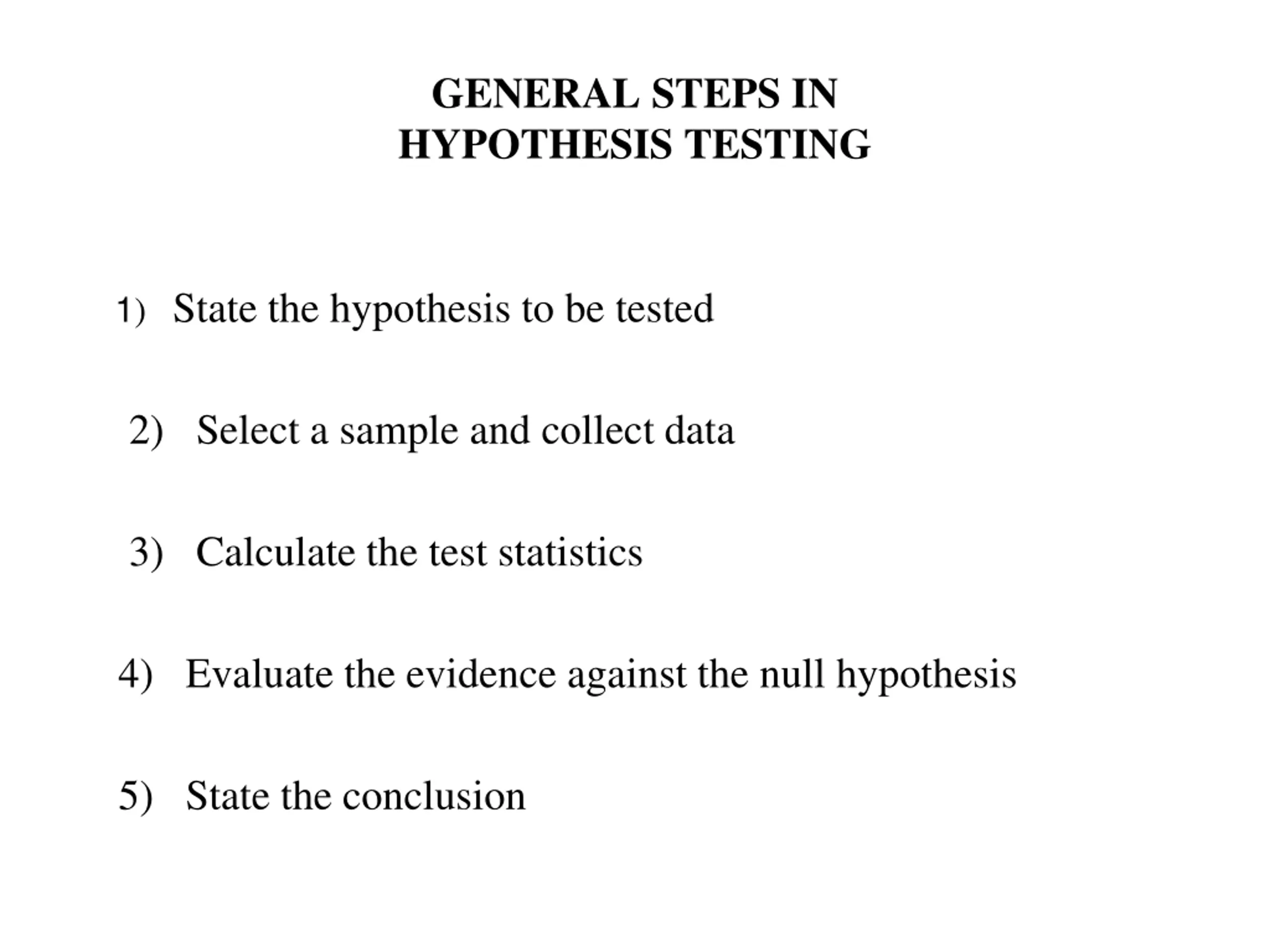 GENERAL STEPS IN HYPOTHESIS TESTING 1) State the hypothesis to be tested 2) Select a sample and collect data 3) Calculate the test statistics 4) Evaluate the evidence against the null hypothesis 5) State the conclusion