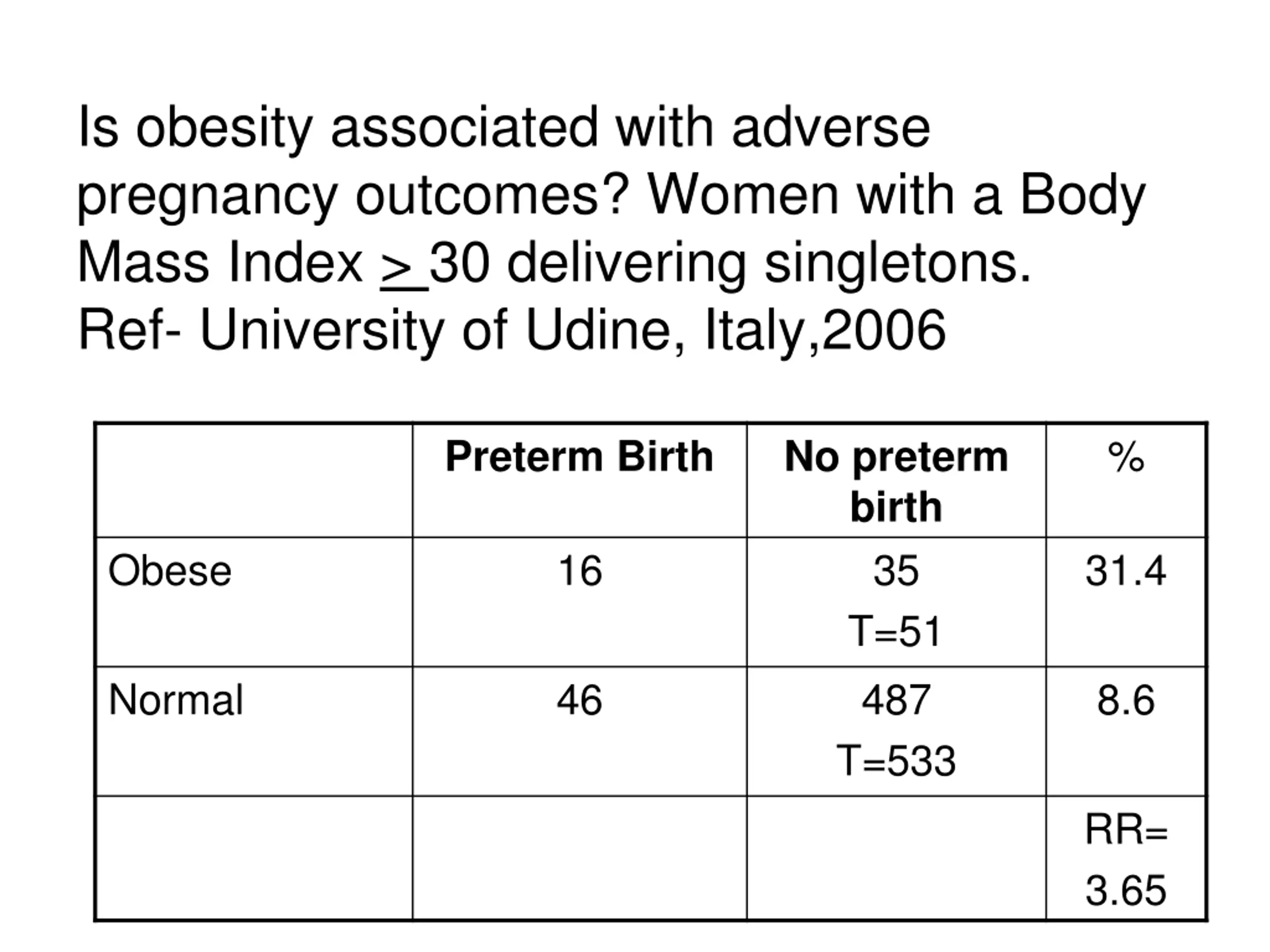 Is obesity associated with adverse pregnancy outcomes? Women with a Body Mass Index > 30 delivering singletons. Ref- University of Udine, Italy,2006 % Preterm Birth No preterm birth 35 T=51 487 T=533 Obese 16 31.4 Normal 46 8.6 RR= 3.65