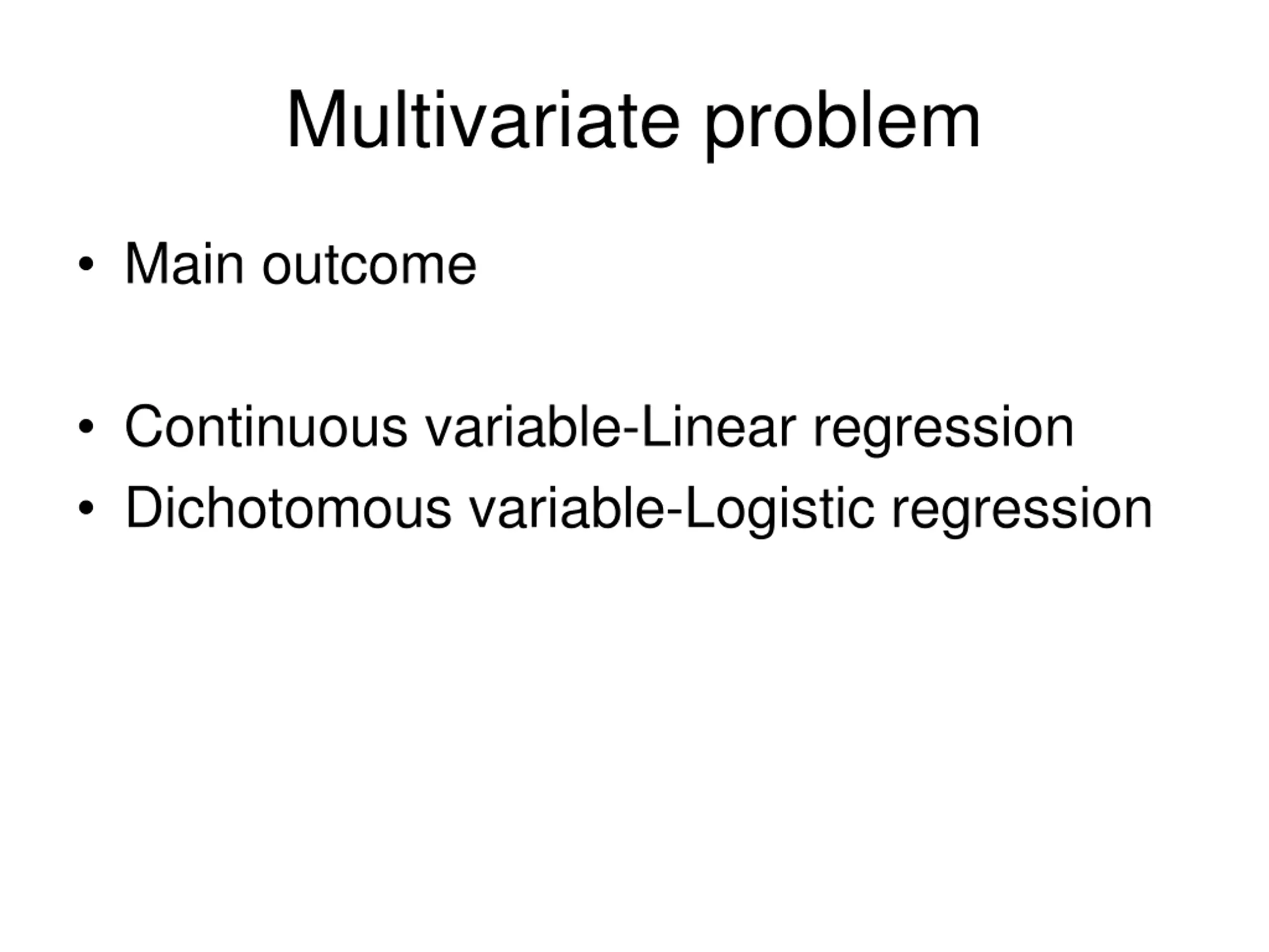 Multivariate problem Main outcome Continuous variable-Linear regression Dichotomous variable-Logistic regression