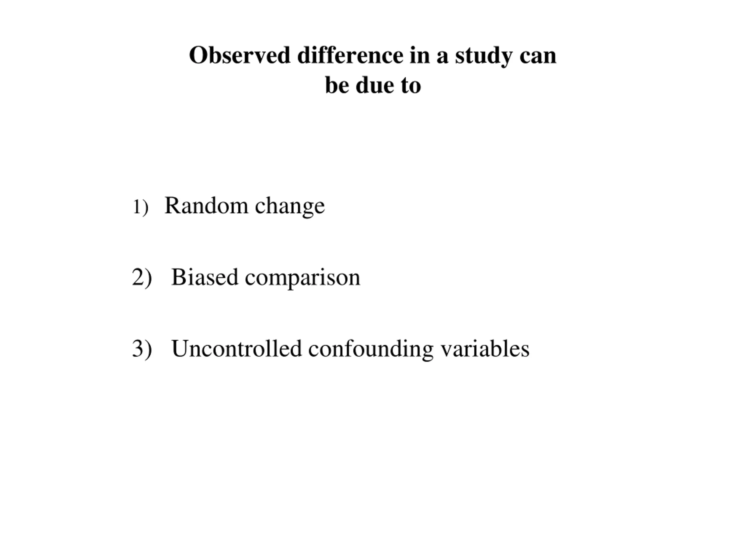 Observed difference in a study can be due to 1) Random change 2) Biased comparison 3) Uncontrolled confounding variables