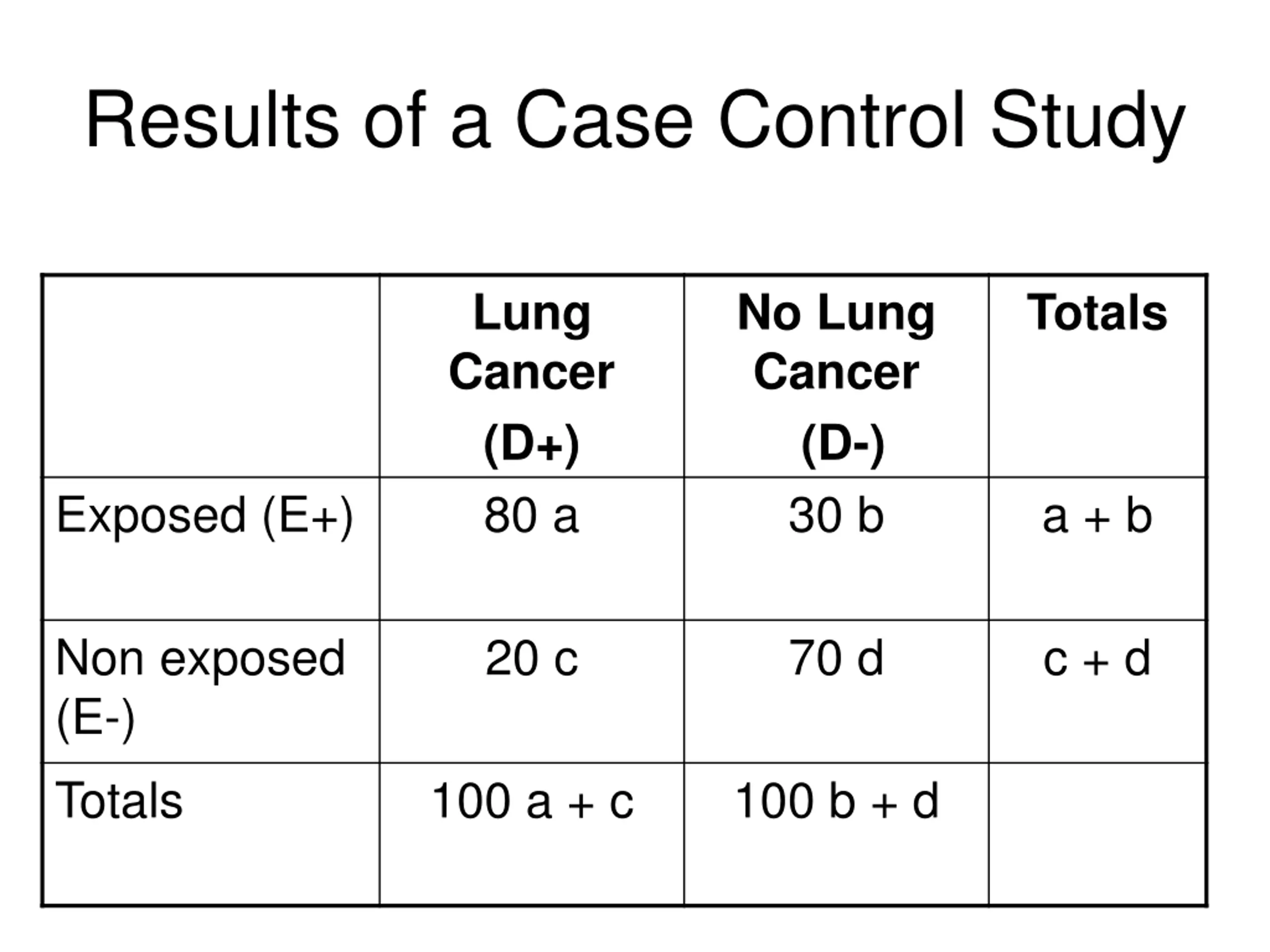 Results of a Case Control Study Lung Cancer (D+) 80 a No Lung Cancer (D-) 30 b Totals Exposed (E+) a + b Non exposed (E-) 20 c 70 d c + d Totals 100 a + c 100 b + d