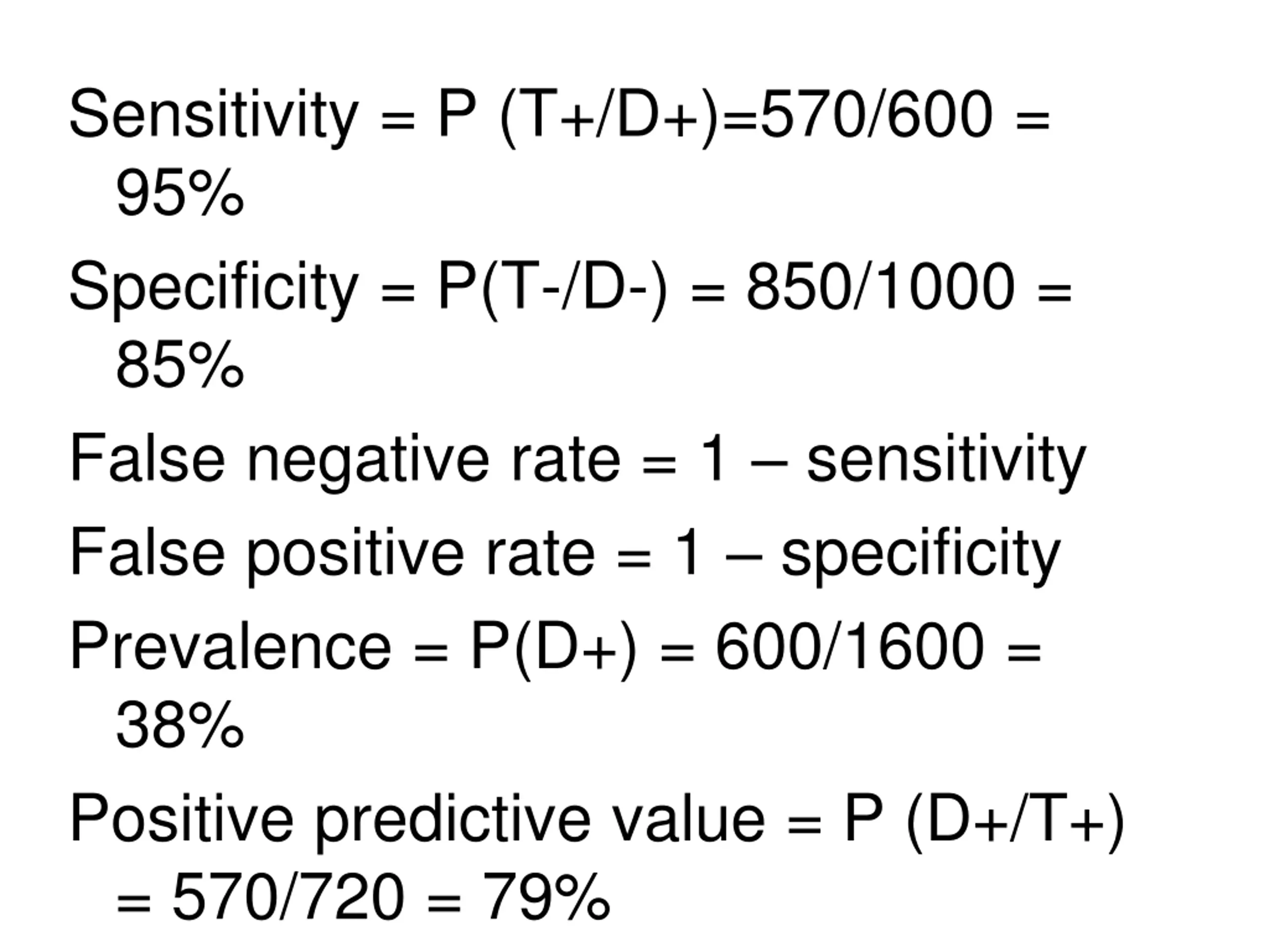 Sensitivity = P (T+/D+)=570/600 = 95% Specificity = P(T-/D-) = 850/1000 = 85% False negative rate = 1 sensitivity False positive rate = 1 specificity Prevalence = P(D+) = 600/1600 = 38% Positive predictive value = P (D+/T+) = 570/720 = 79%