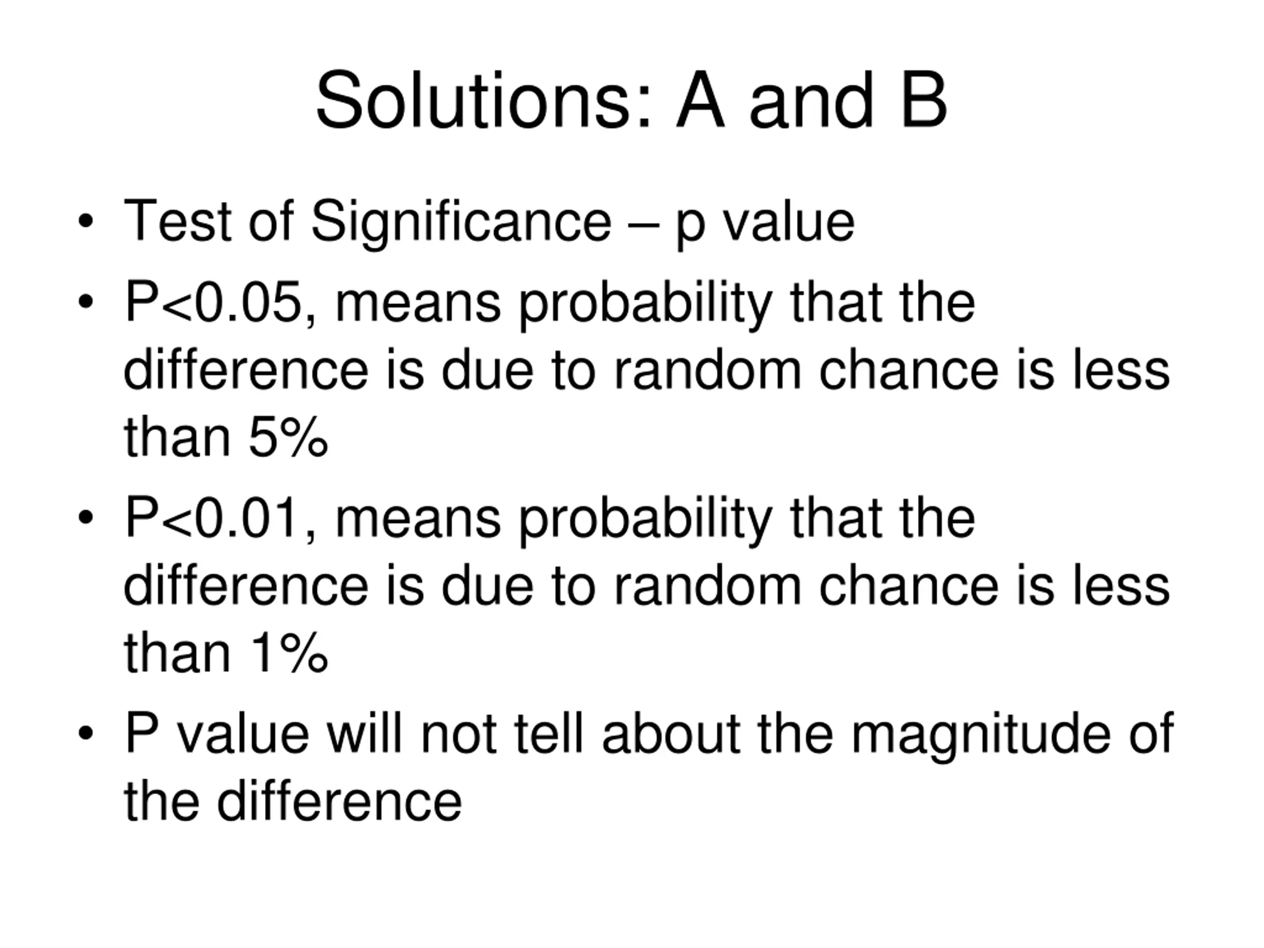 Solutions: A and B Test of Significance p value P<0.05, means probability that the difference is due to random chance is less than 5% P<0.01, means probability that the difference is due to random chance is less than 1% P value will not tell about the magnitude of the difference