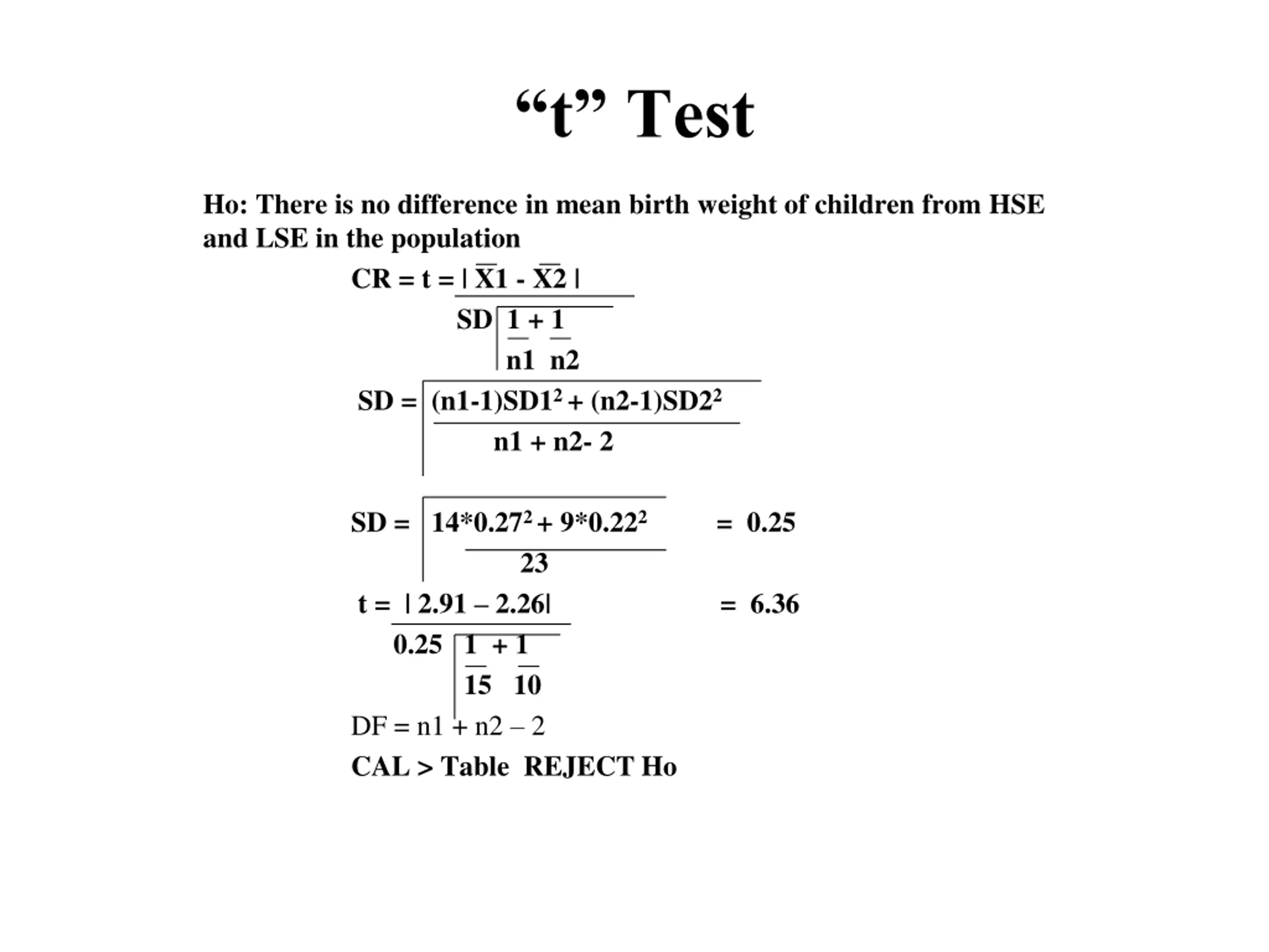 t Test Ho: There is no difference in mean birth weight of children from HSE and LSE in the population CR = t = | X1 - X2 | SD 1 + 1 n1 n2 SD = (n1-1)SD12 + (n2-1)SD22 n1 + n2- 2 SD = 14*0.272 + 9*0.222 = 0.25 23 t = | 2.91 2.26| = 6.36 0.25 1 + 1 15 10 DF = n1 + n2 2 CAL > Table REJECT Ho