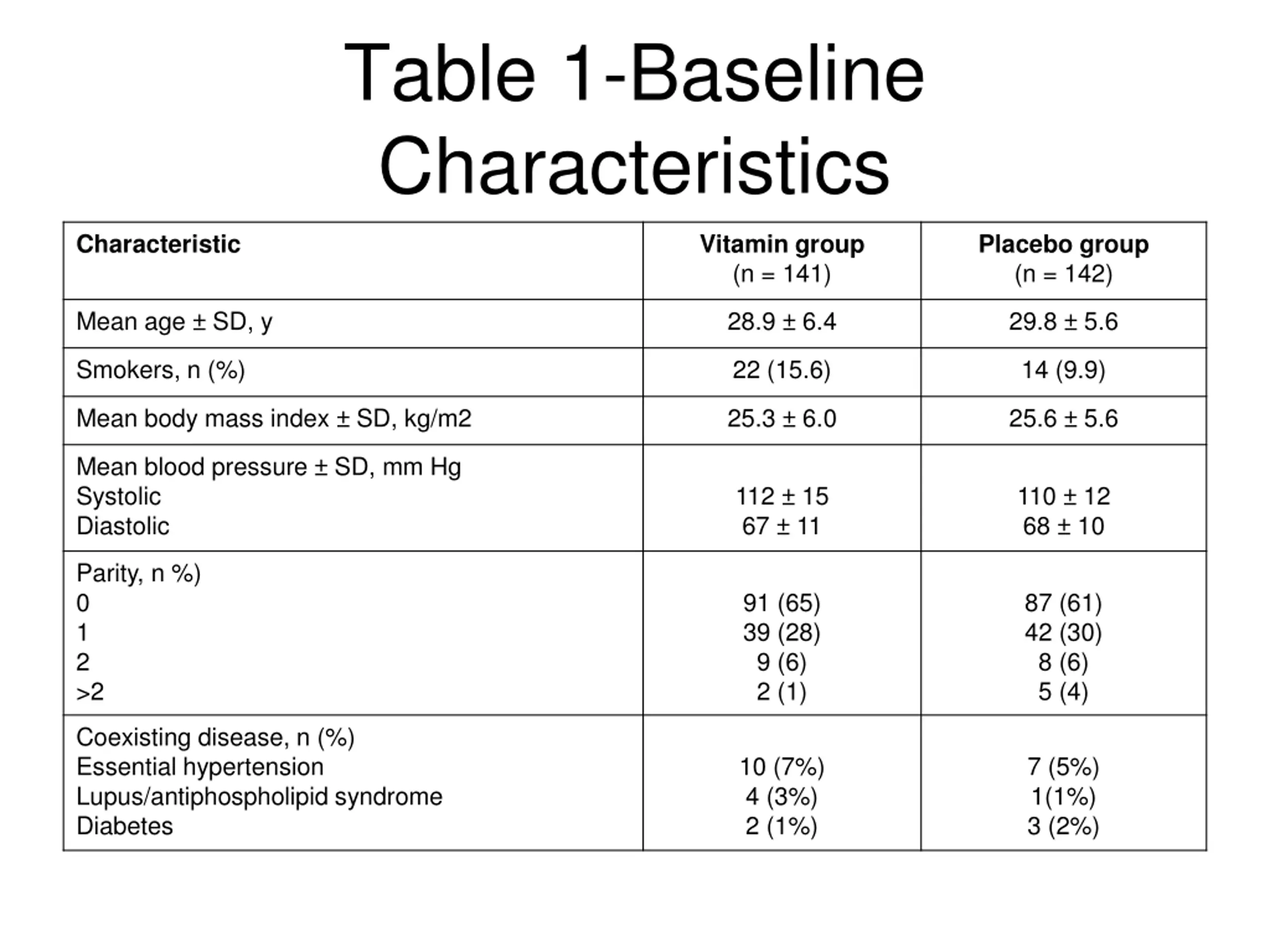 Table 1-Baseline Characteristics Vitamin group (n = 141) Placebo group (n = 142) Characteristic Mean age SD, y 28.9 6.4 29.8 5.6 Smokers, n (%) 22 (15.6) 14 (9.9) Mean body mass index SD, kg/m2 25.3 6.0 25.6 5.6 Mean blood pressure SD, mm Hg Systolic Diastolic 112 15 67 11 110 12 68 10 Parity, n %) 0 1 2 >2 91 (65) 39 (28) 9 (6) 2 (1) 87 (61) 42 (30) 8 (6) 5 (4) Coexisting disease, n (%) Essential hypertension Lupus/antiphospholipid syndrome Diabetes 10 (7%) 4 (3%) 2 (1%) 7 (5%) 1(1%) 3 (2%)