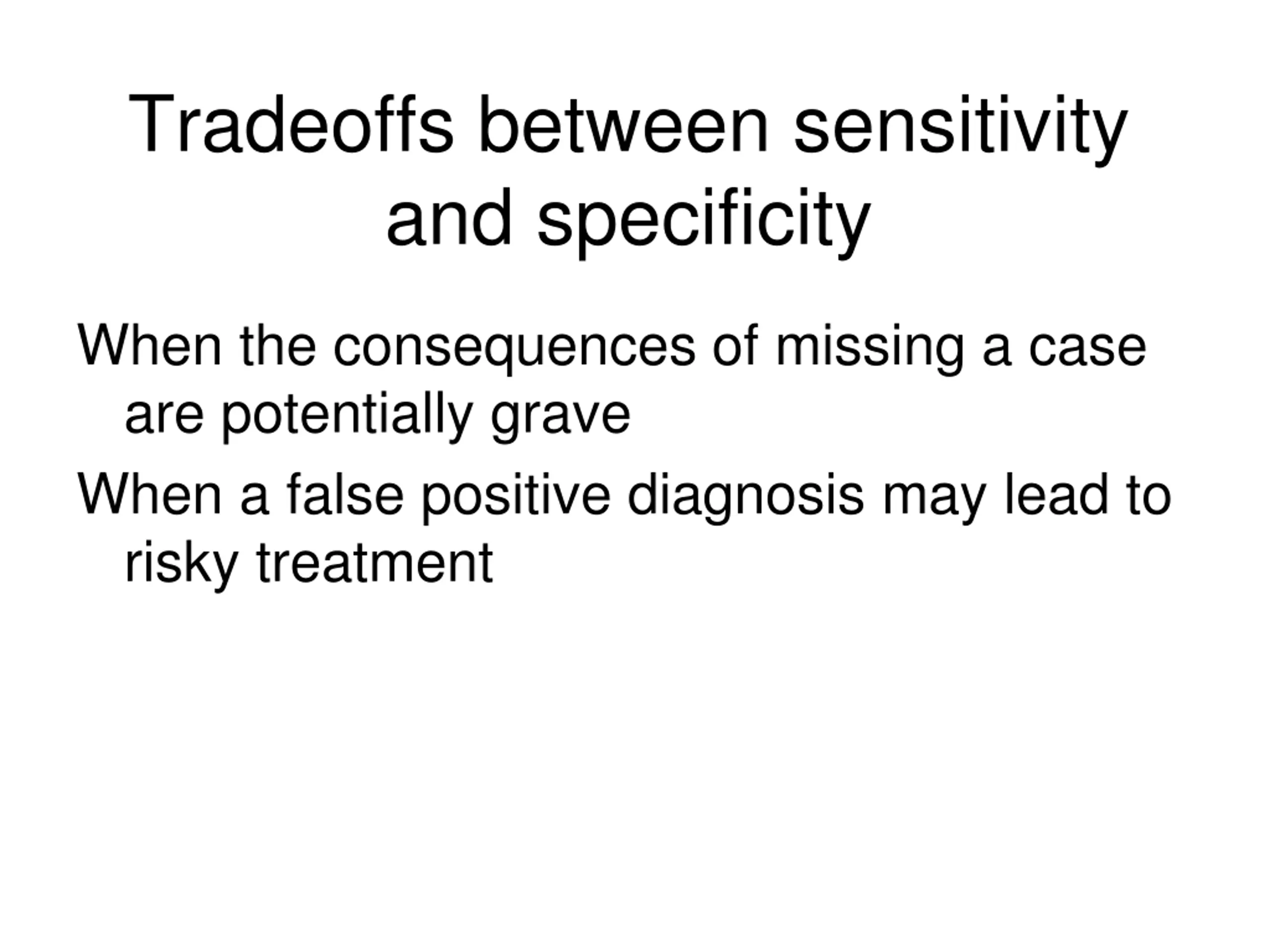 Tradeoffs between sensitivity and specificity When the consequences of missing a case are potentially grave When a false positive diagnosis may lead to risky treatment