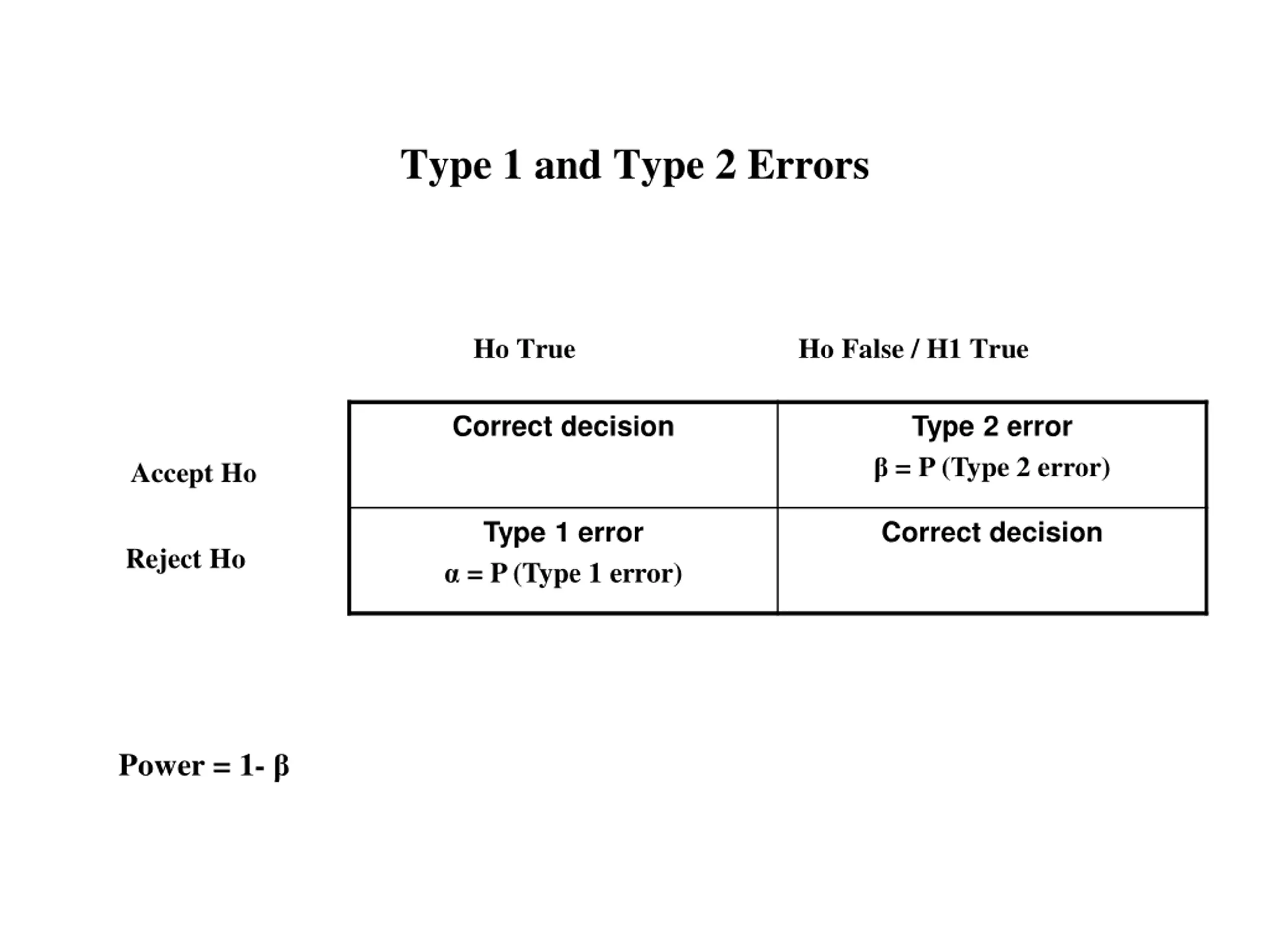 Type 1 and Type 2 Errors Ho TrueHo False / H1 True Correct decision Type 2 error = P (Type 2 error) Accept Ho Reject Ho Type 1 error = P (Type 1 error) Correct decision Power = 1-