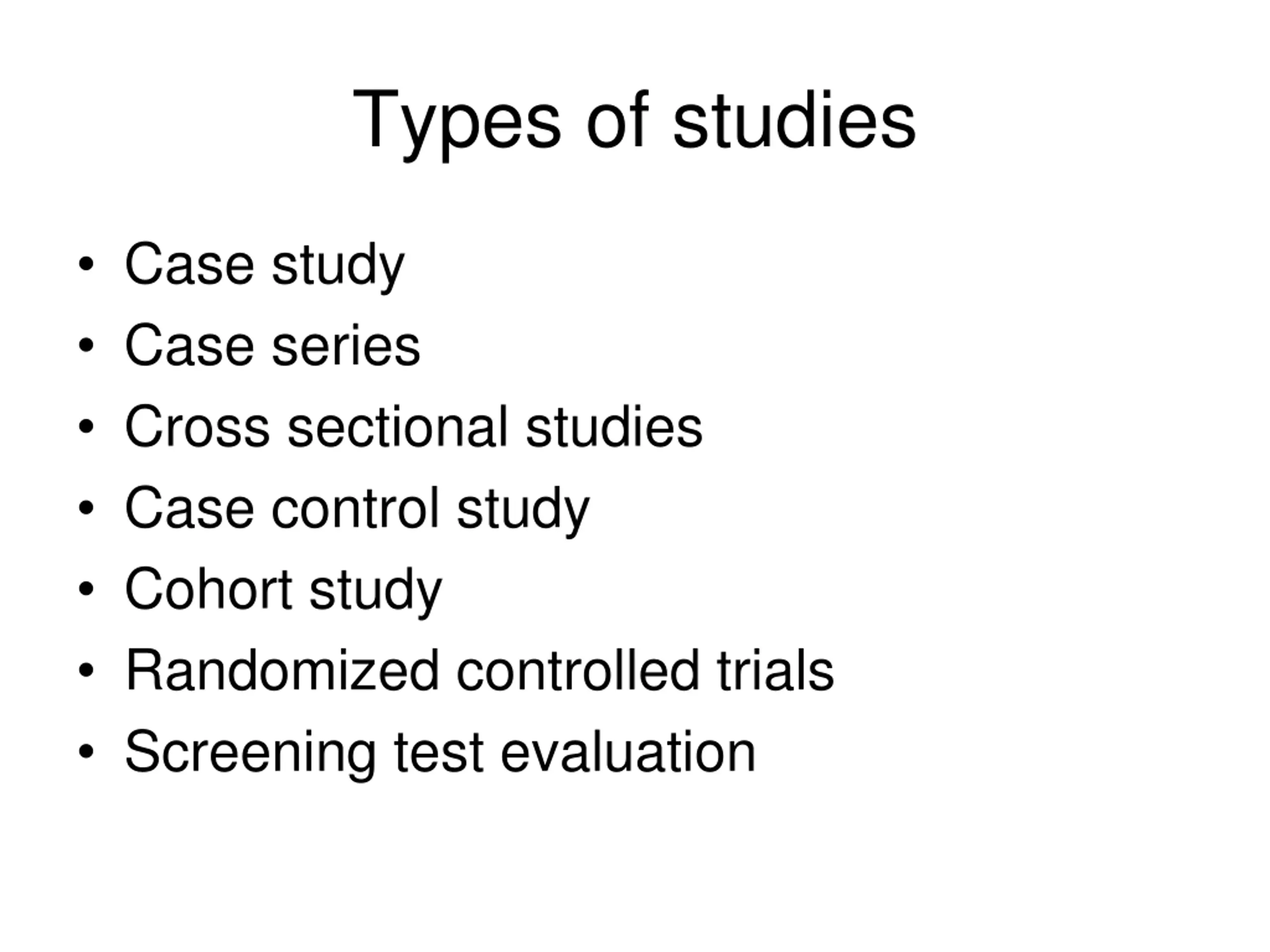 Types of studies Case study Case series Cross sectional studies Case control study Cohort study Randomized controlled trials Screening test evaluation