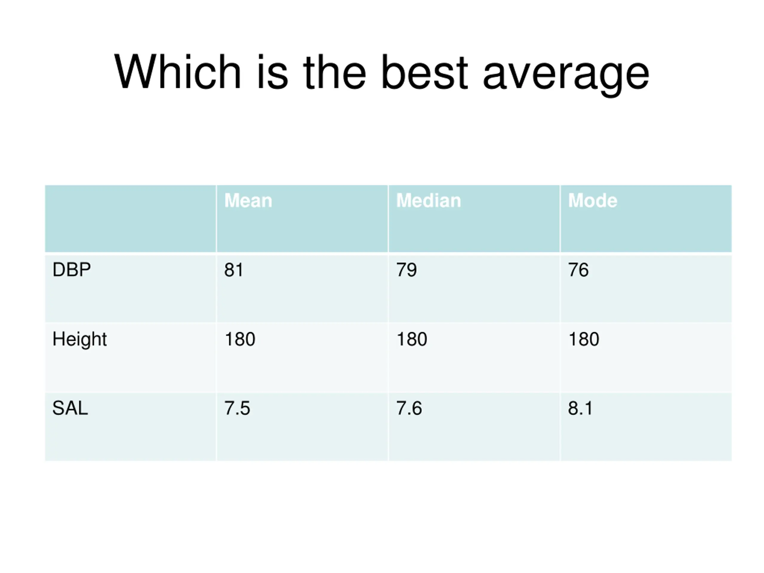 Which is the best average Mean Median Mode DBP 81 79 76 Height 180 180 180 SAL 7.5 7.6 8.1