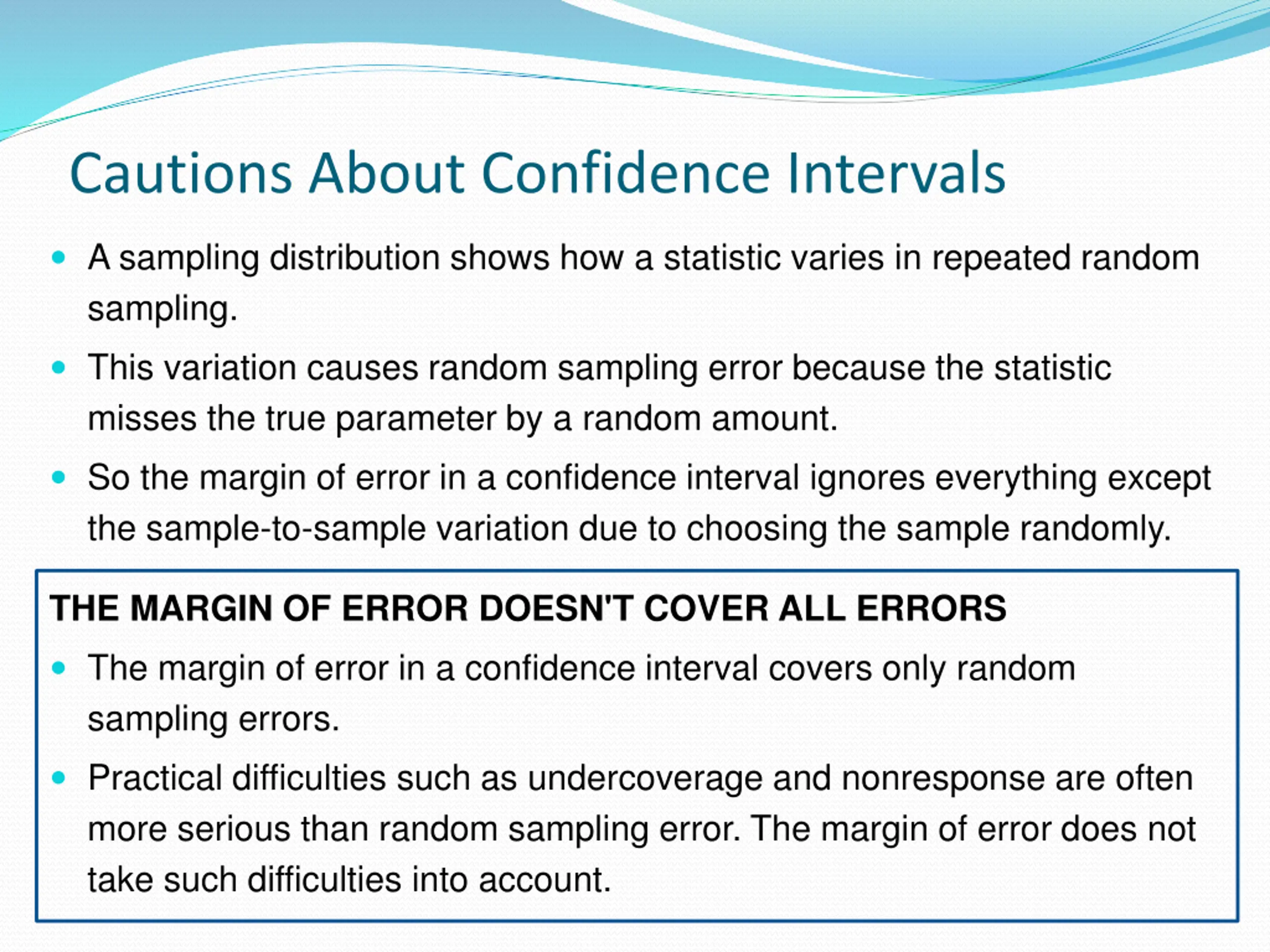 Cautions About Confidence Intervals A sampling distribution shows how a statistic varies in repeated random sampling. This variation causes random sampling error because the statistic misses the true parameter by a random amount. So the margin of error in a confidence interval ignores everything except the sample-to-sample variation due to choosing the sample randomly. THE MARGIN OF ERROR DOESN'T COVER ALL ERRORS The margin of error in a confidence interval covers only random sampling errors. Practical difficulties such as undercoverage and nonresponse are often more serious than random sampling error. The margin of error does not take such difficulties into account.
