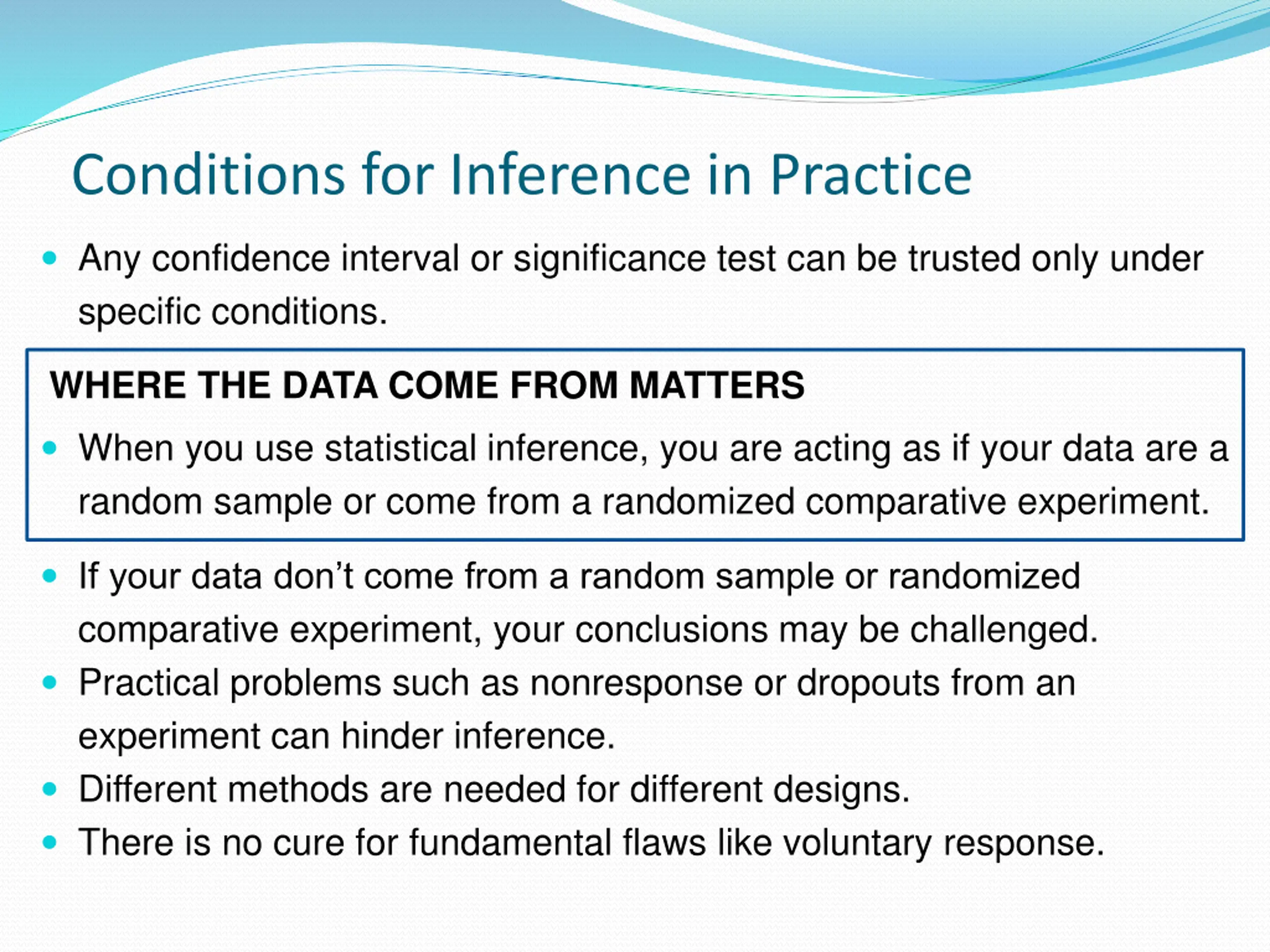 Conditions for Inference in Practice Any confidence interval or significance test can be trusted only under specific conditions. WHERE THE DATA COME FROM MATTERS When you use statistical inference, you are acting as if your data are a random sample or come from a randomized comparative experiment. If your data don t come from a random sample or randomized comparative experiment, your conclusions may be challenged. Practical problems such as nonresponse or dropouts from an experiment can hinder inference. Different methods are needed for different designs. There is no cure for fundamental flaws like voluntary response.